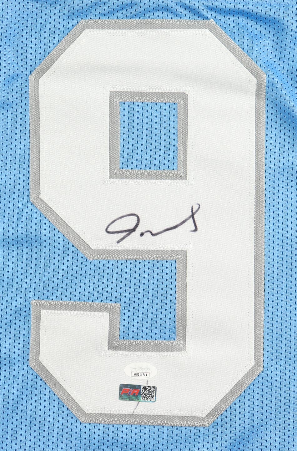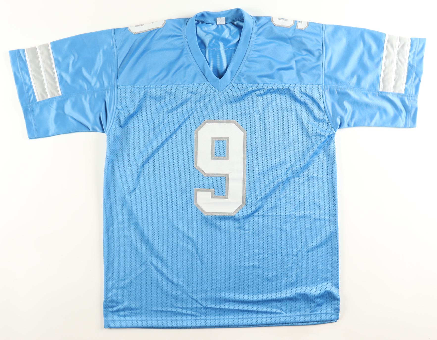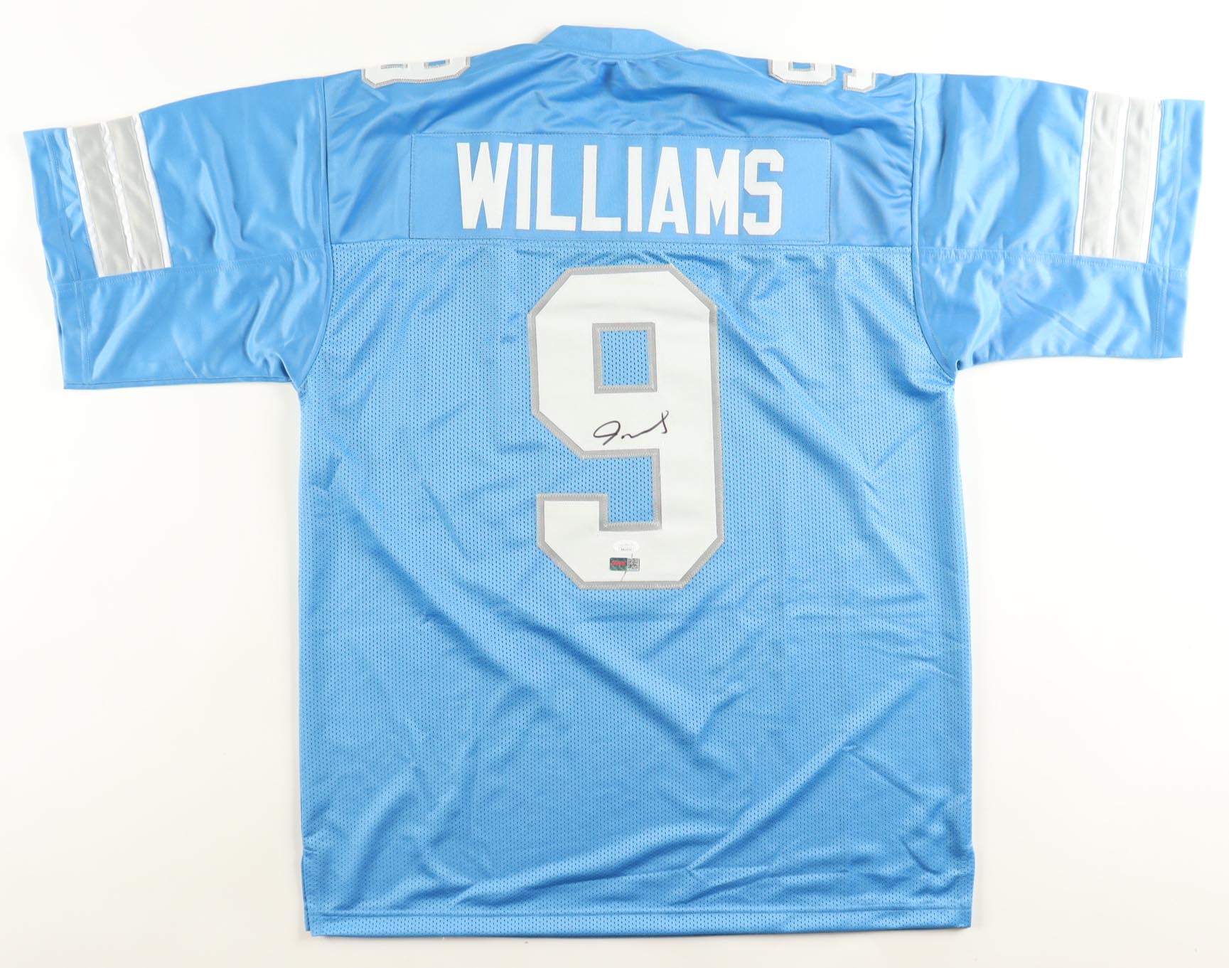 Custom jersey with everything sewn on, size XL. Hand-signed by Jameson Williams. Please note, there is a stray pen mark near the hologram.