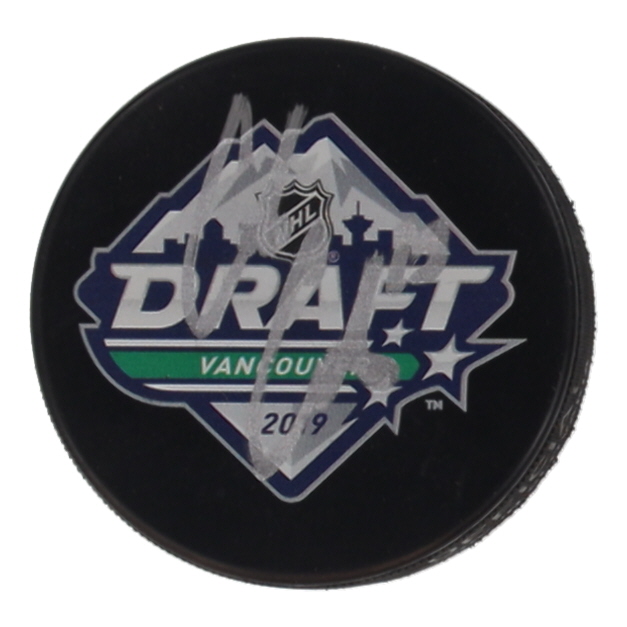 2019 NHL Draft Logo Hockey Puck. Hand-signed by Cole Caufield (Montreal Canadiens).