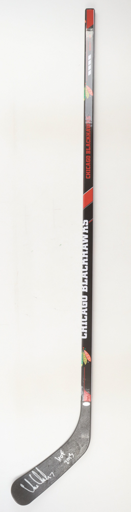 Chicago Blackhawks 48" full-size hockey stick has been hand-signed and inscribed by Chris Chelios (HOF).