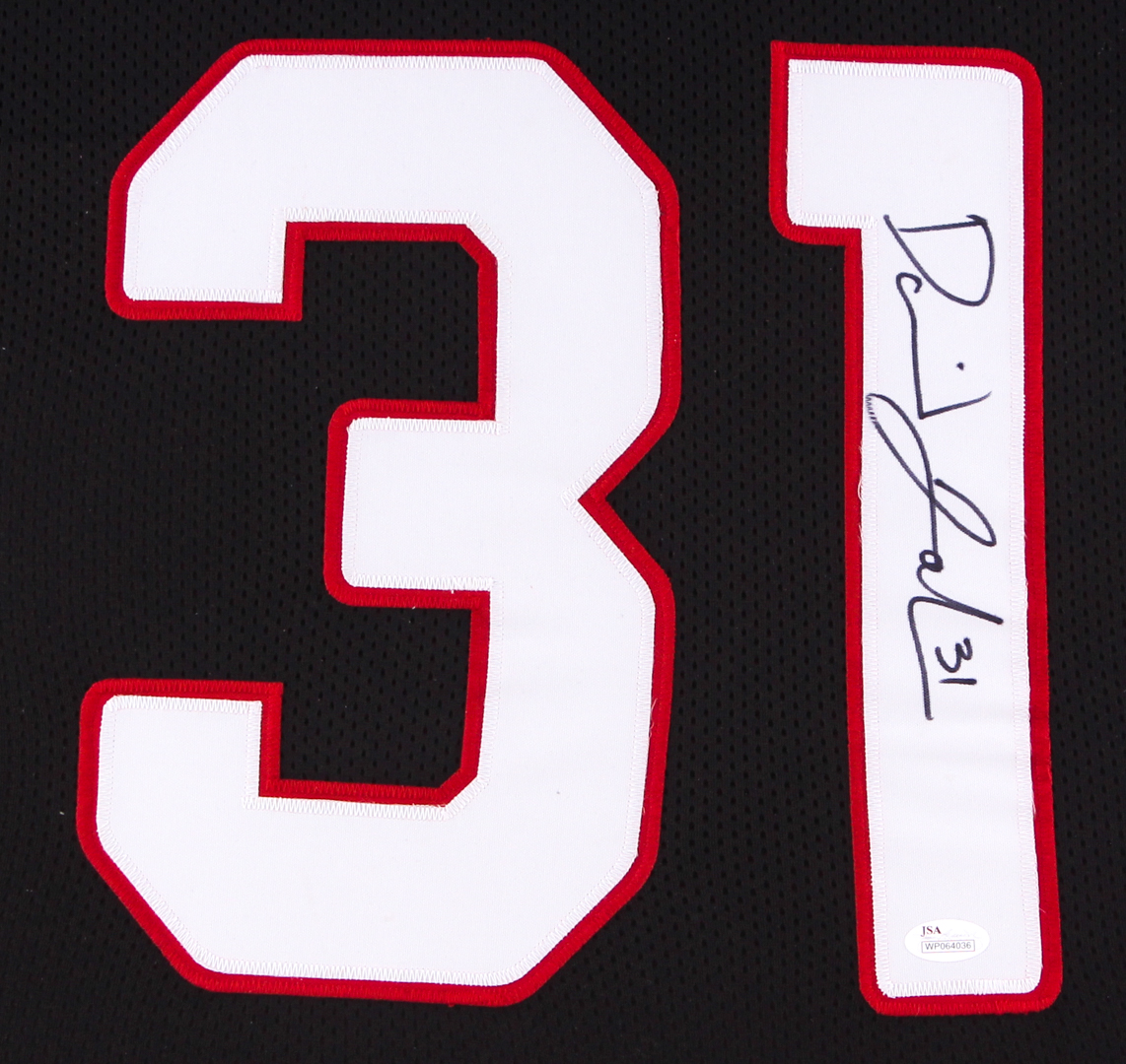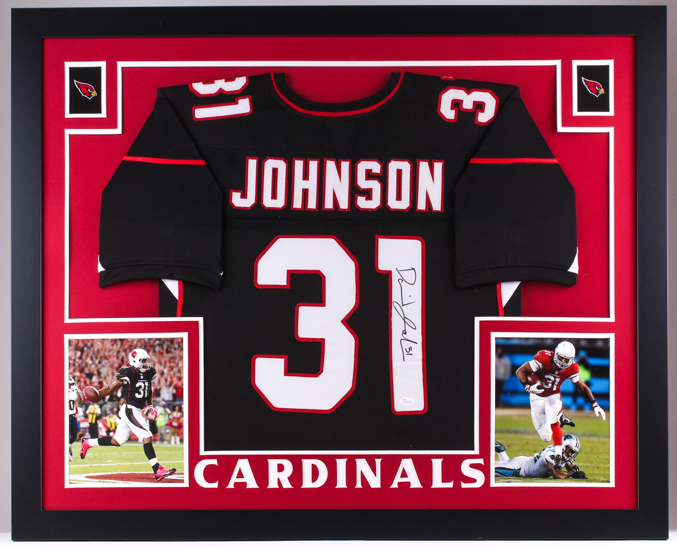 Custom frame measures approximately 35" x 43" in size and features a jersey which has been hand-signed in black felt tip pen by David Johnson.