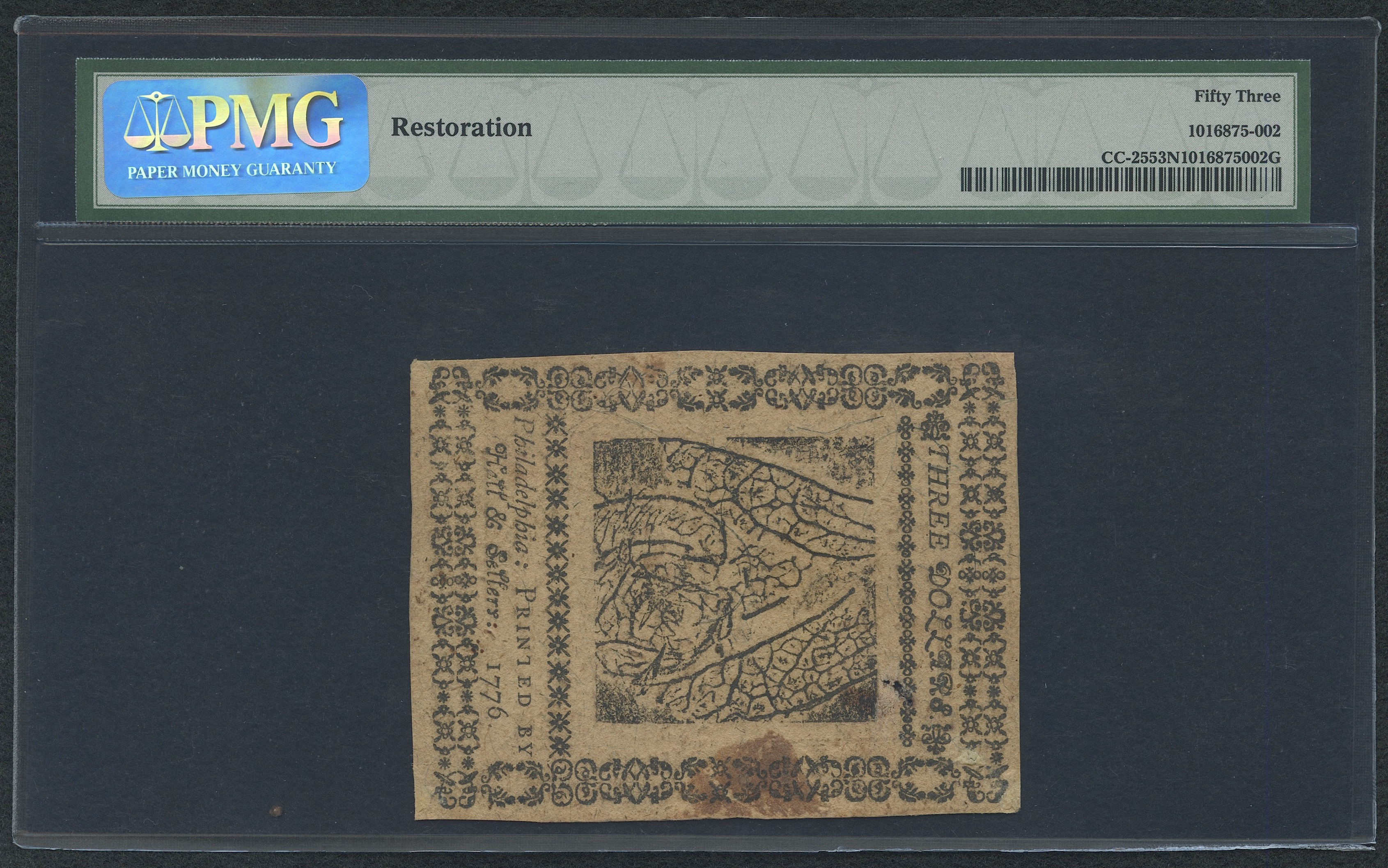 CC-25. Three dollar continental currency note Issued on February 17, 1776.