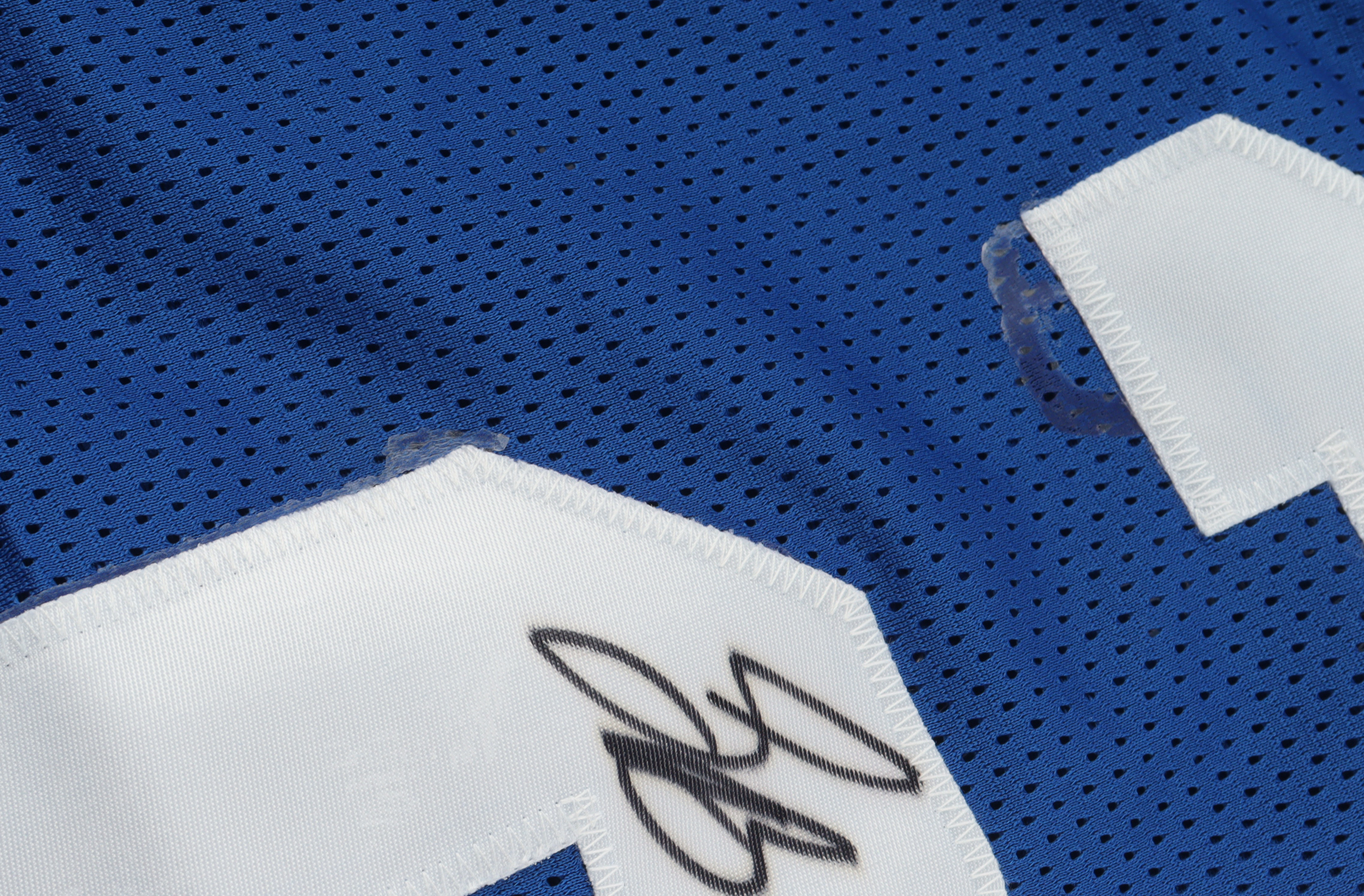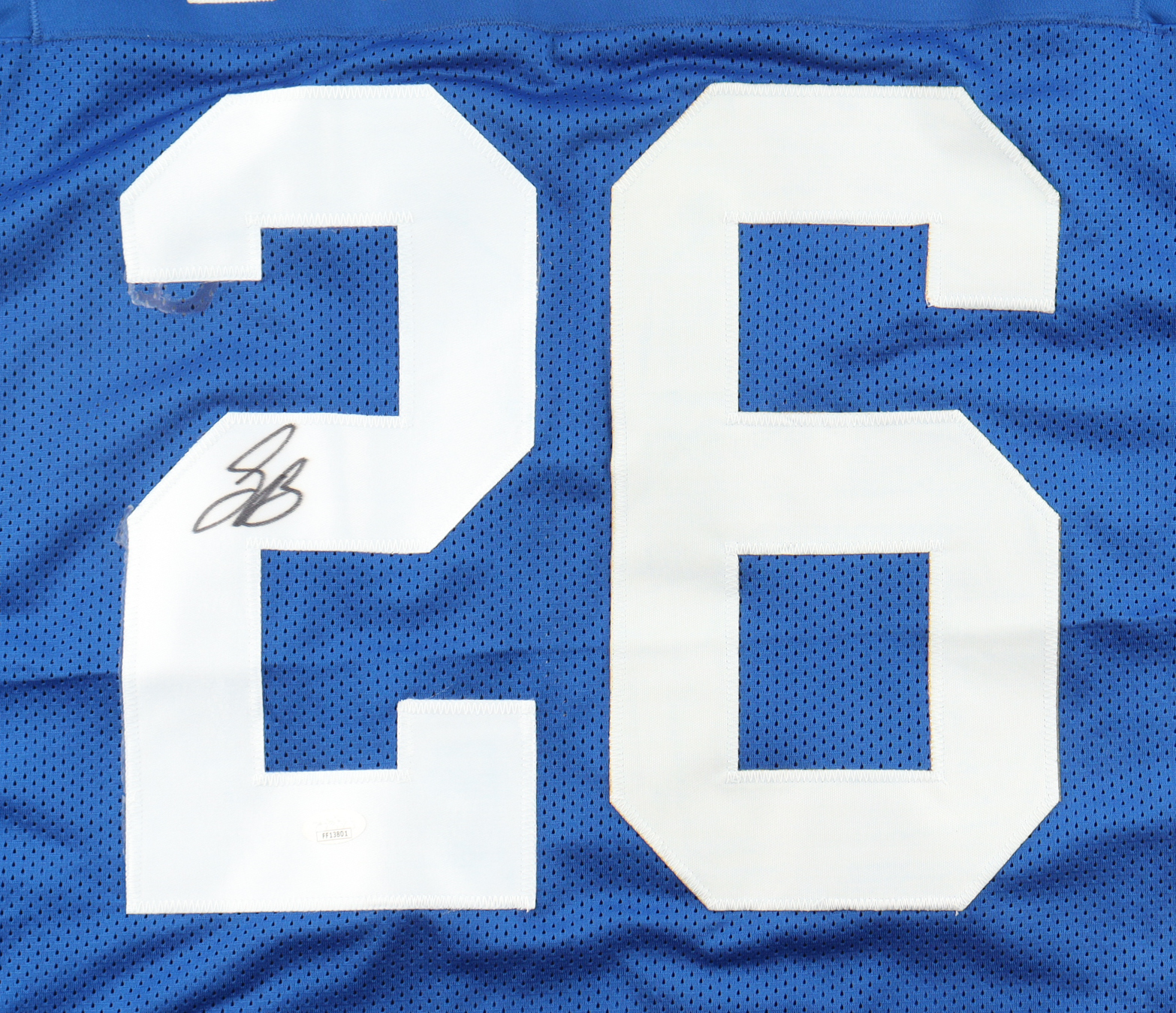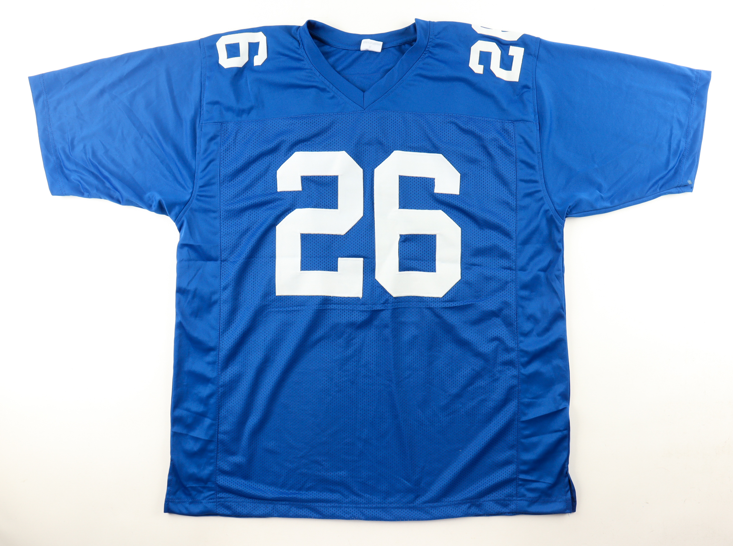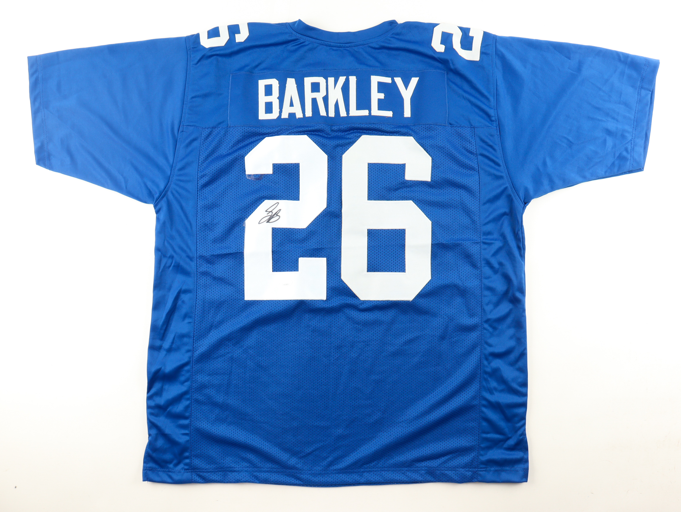 Custom jersey with everything sewn on, size XL. Hand-signed by Saquon Barkley. Please note, glue is visible along the sleeve and adjacent to the reverse number. See photos for more detail regarding the condition of the item.