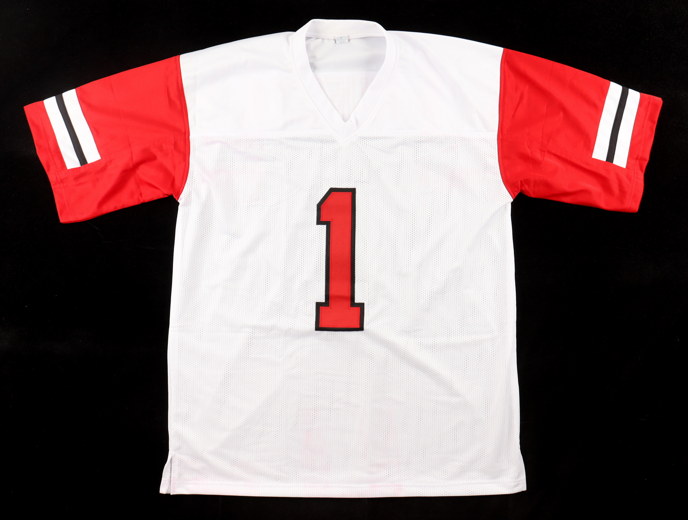 Custom jersey with everything sewn on, size XL. Hand-signed by Deebo Samuel. Please note, the red dye has bled.