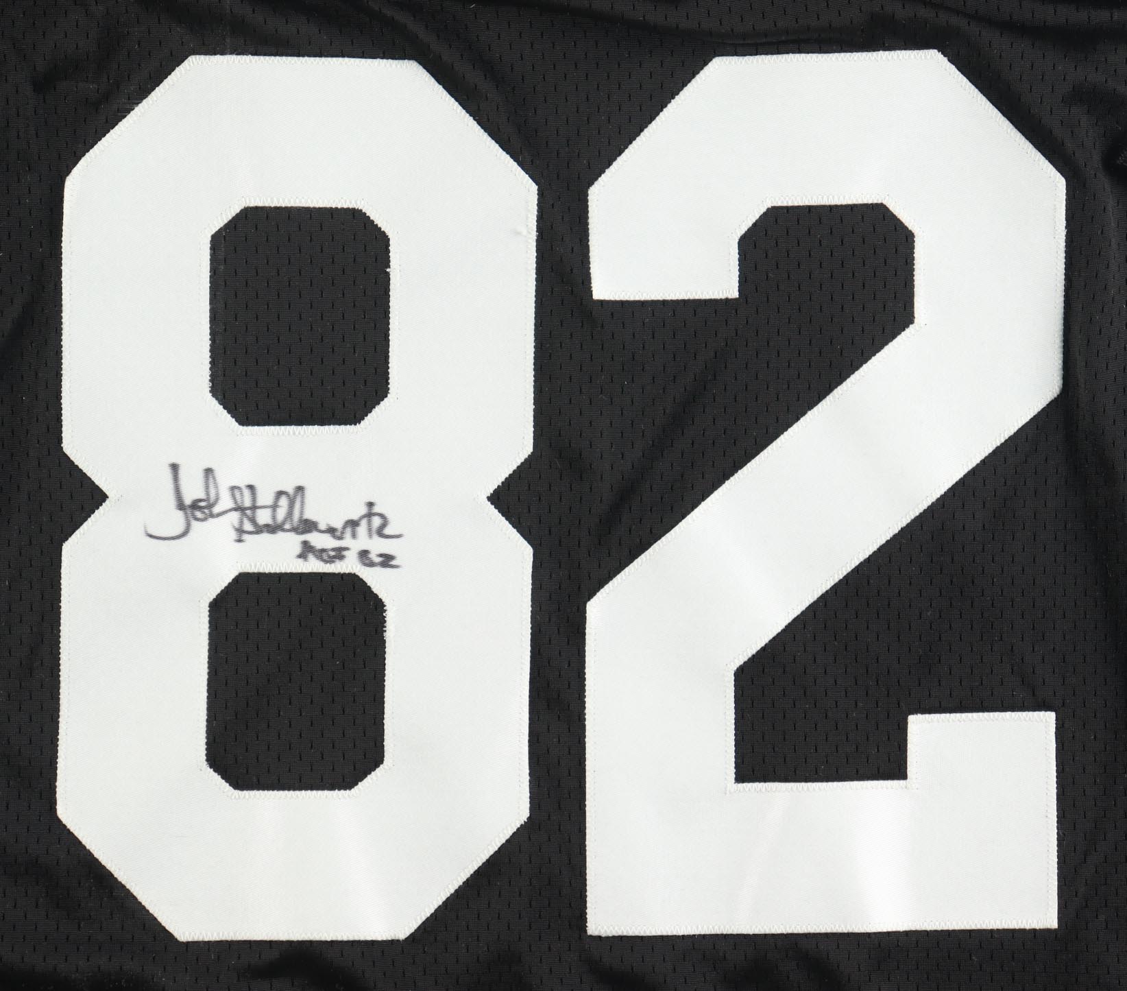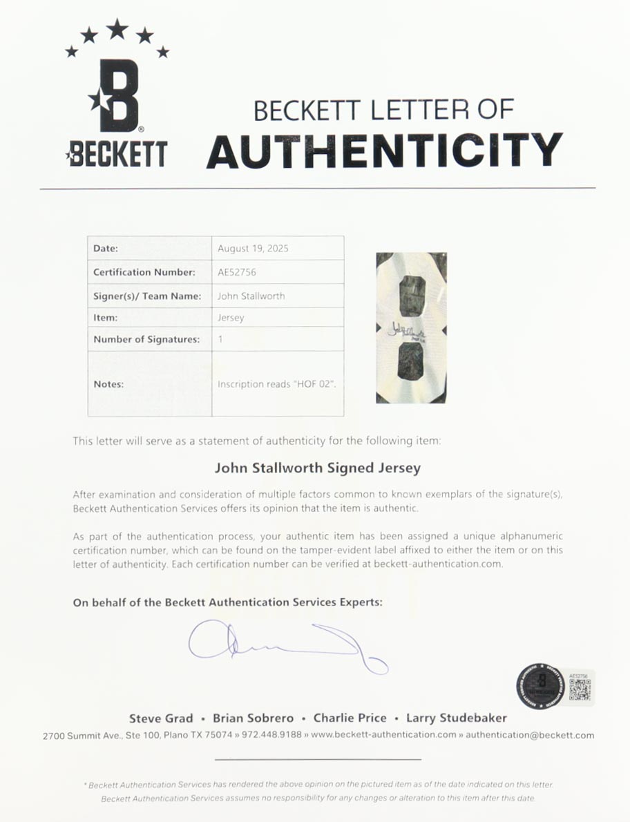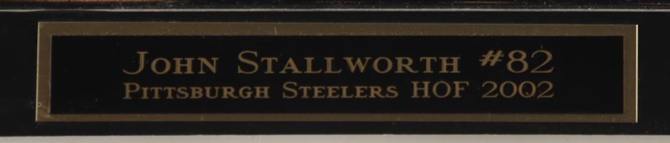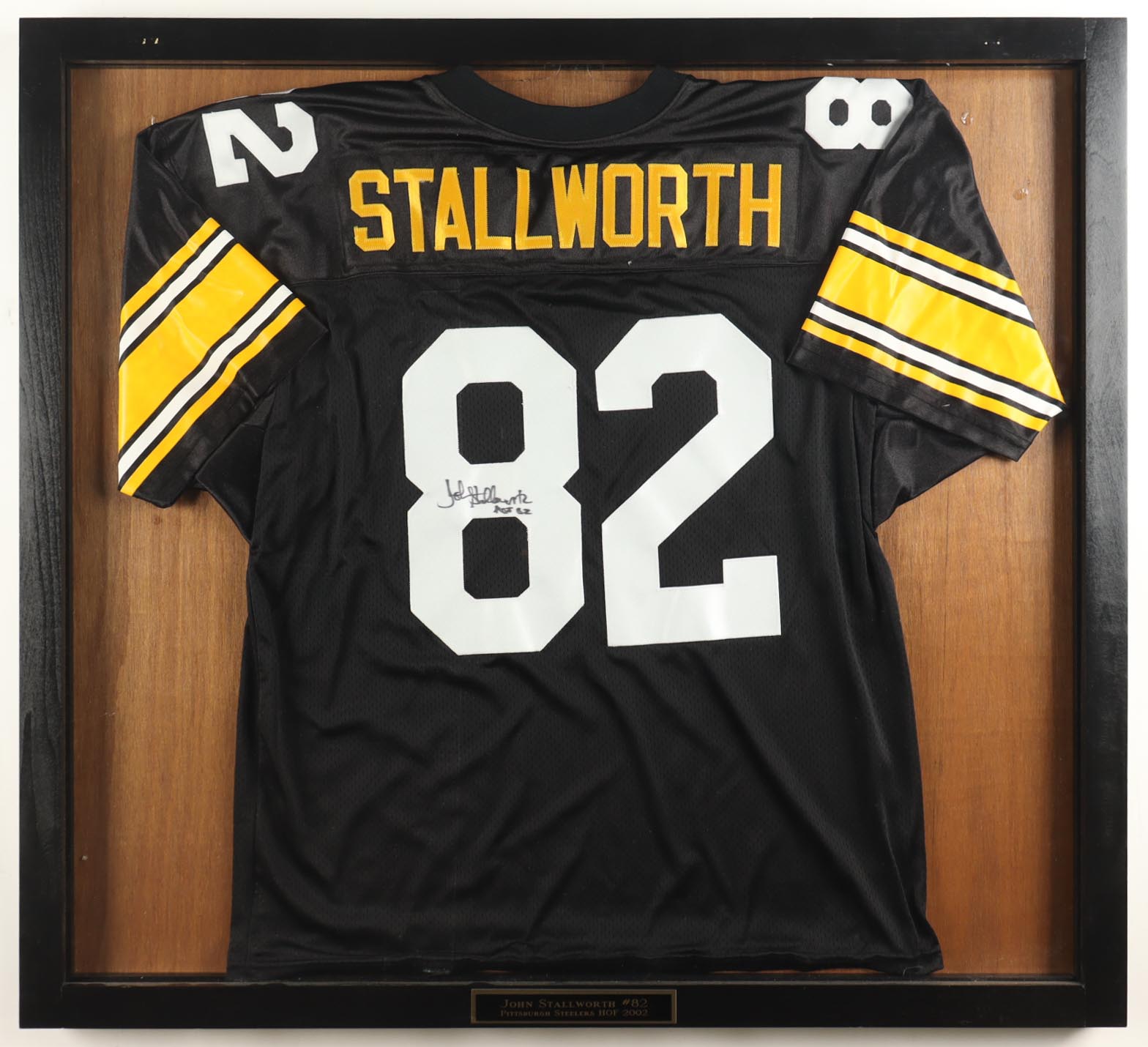 Custom frame measures approximately 36" x 39.5" in size and features a jersey hand-signed and inscribed by John Stallworth (HOF). Please note there are staple marks on the top of the frame, see photos for more details.