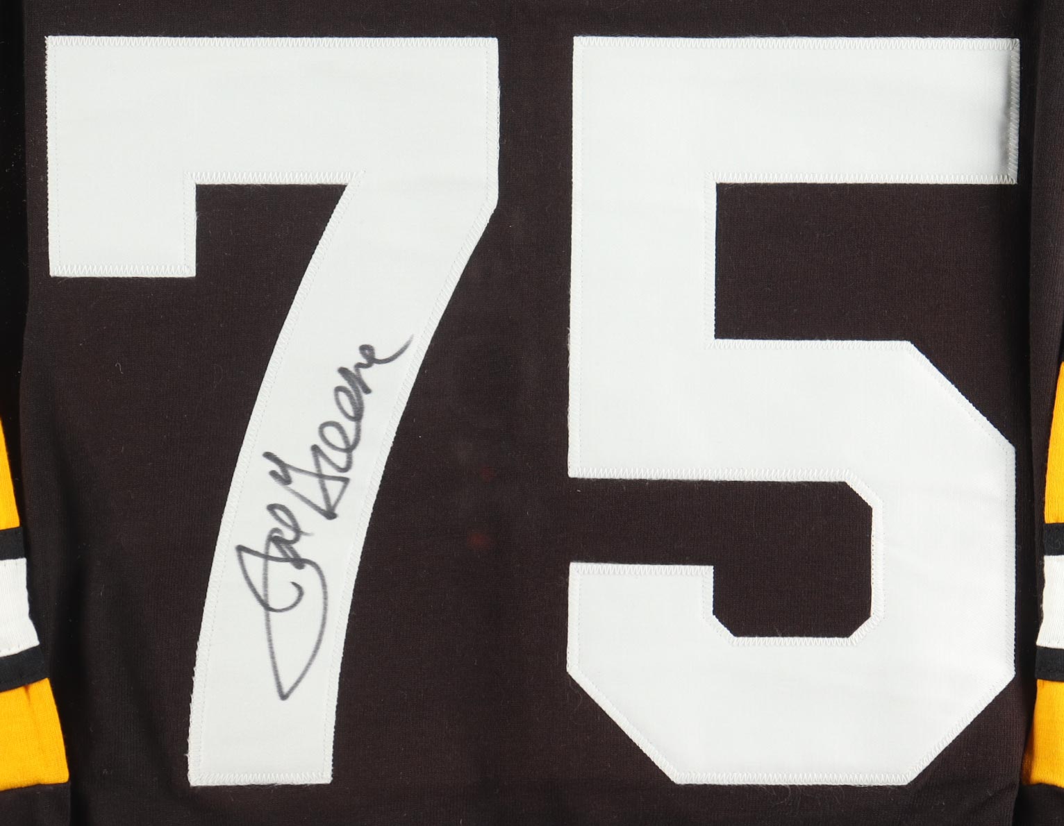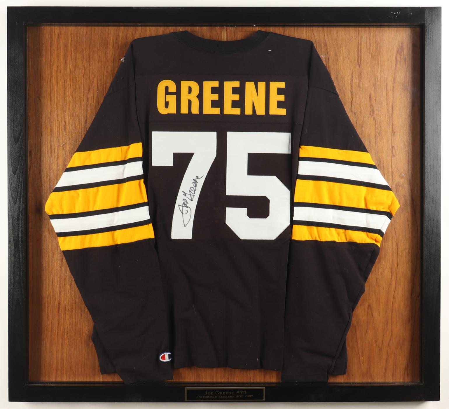 Custom frame measures approximately 36" x 39.5" in size and features a jersey hand-signed by Joe Greene (HOF). Please note the frame has damage throughout, see photos for more details.