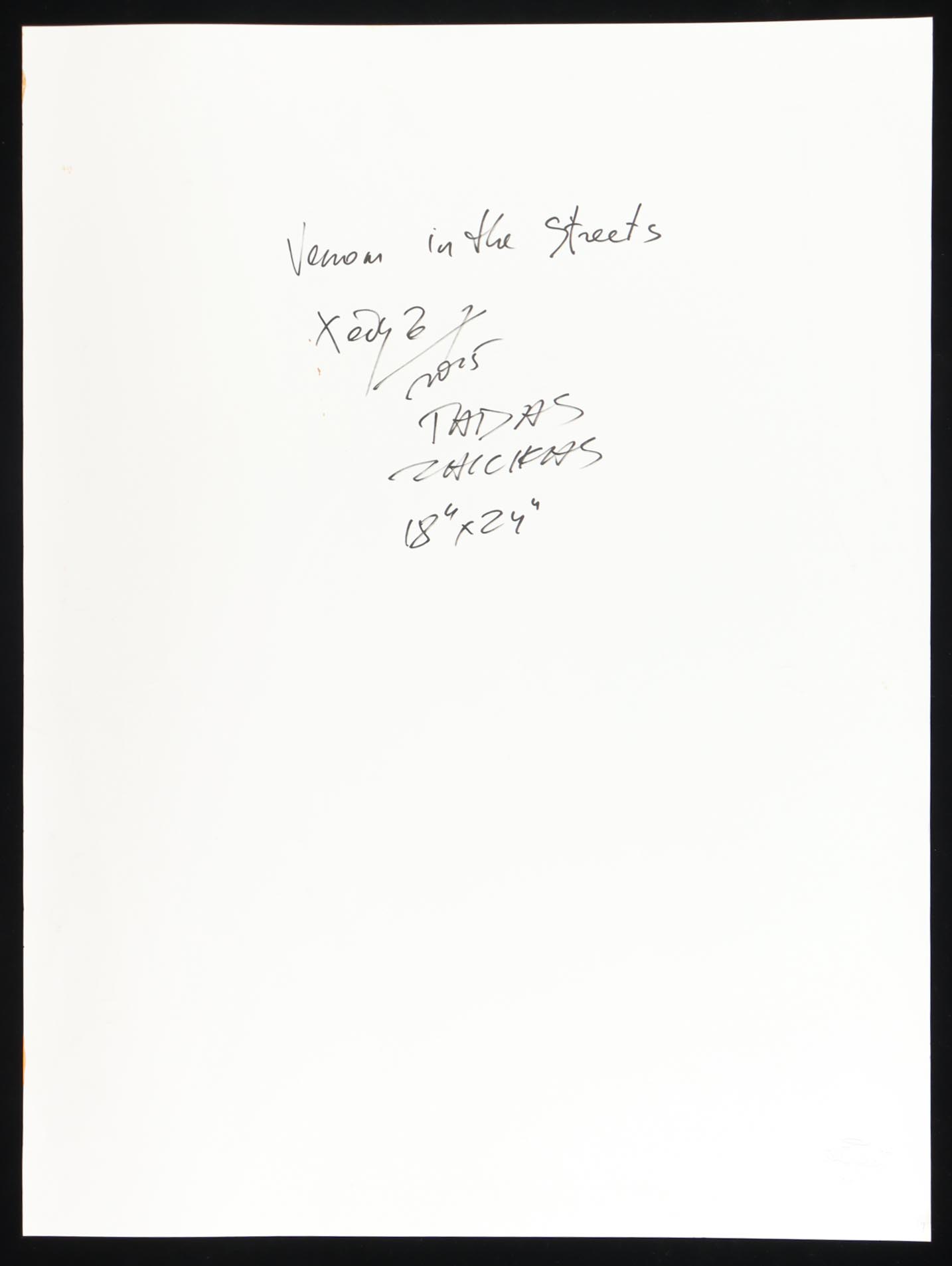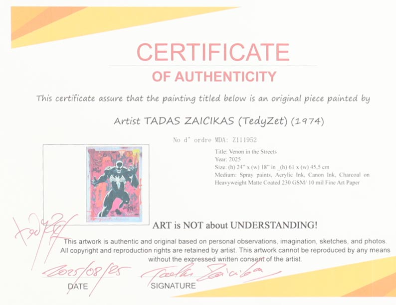 This mixed media piece with acrylic paint on premium 230 GSM paper measures 18" x 24" in size. The piece is titled "Venom in the Streets" and is hand-signed and titled by the artist, Tadas Zaicikas (TedyZet).