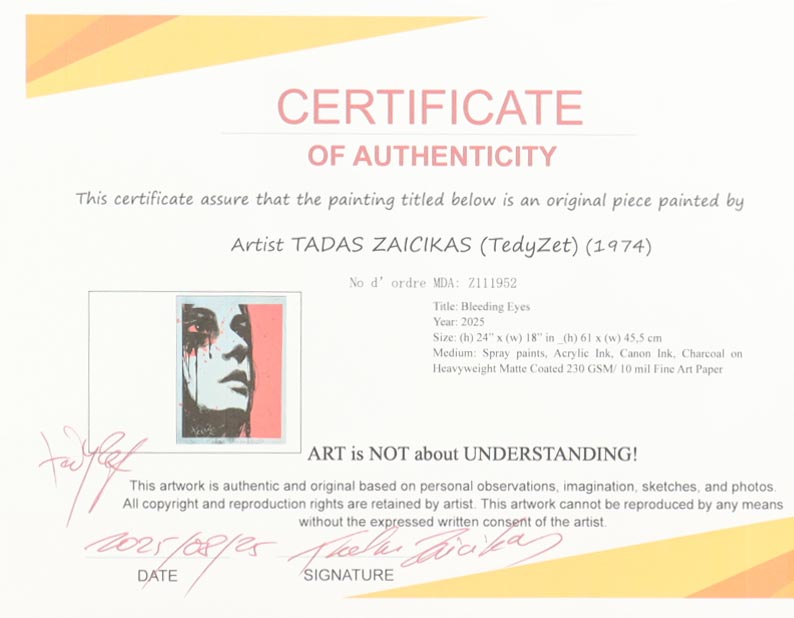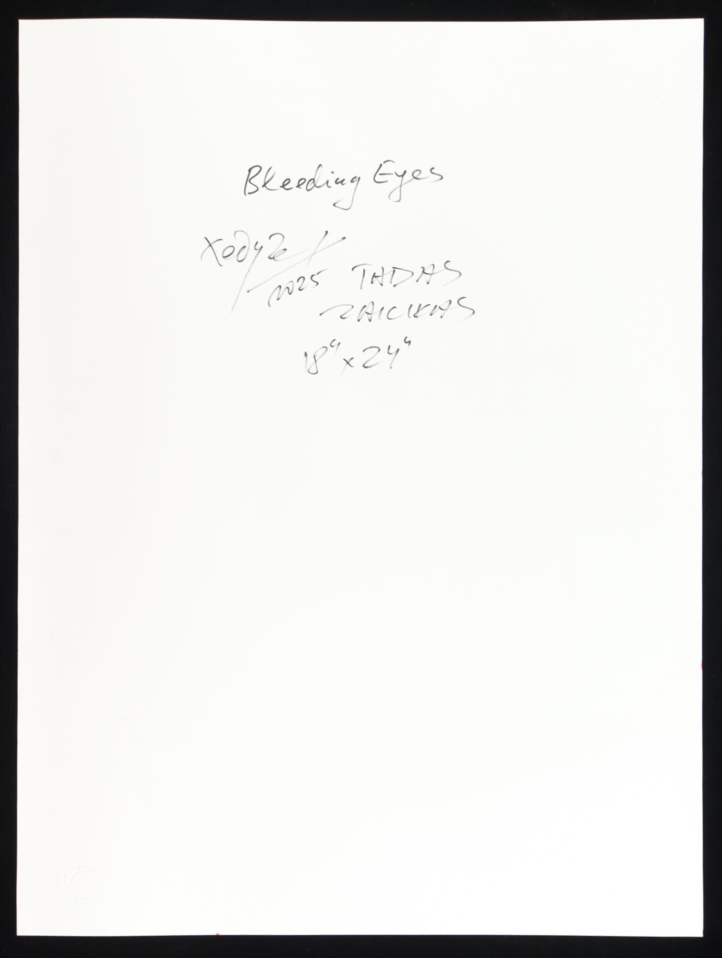 This mixed media piece with acrylic paint on premium 230 GSM paper measures 18" x 24" in size. The piece is titled "Bleeding Eyes" and is hand-signed and titled by the artist, Tadas Zaicikas (TedyZet).