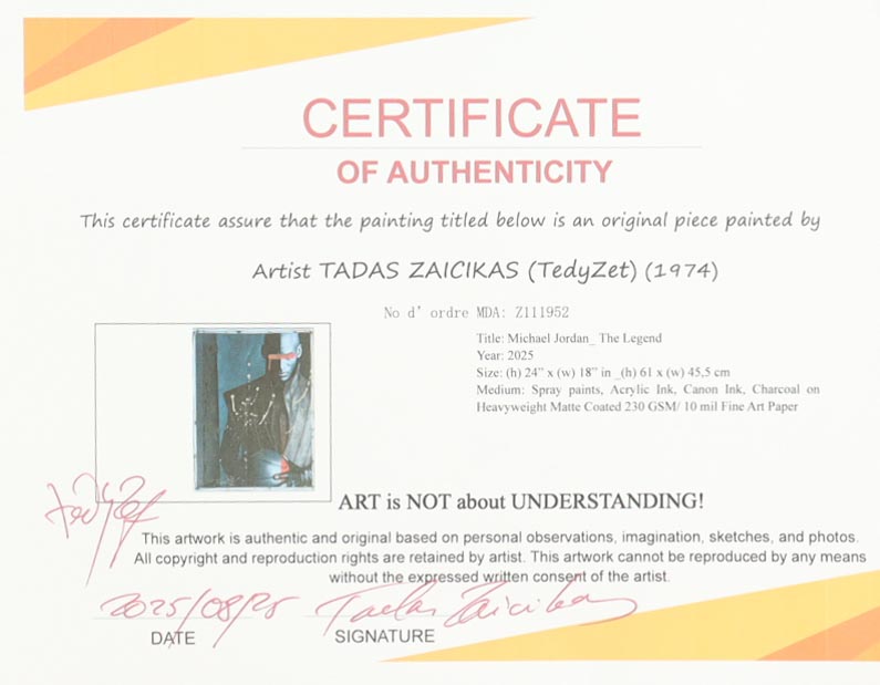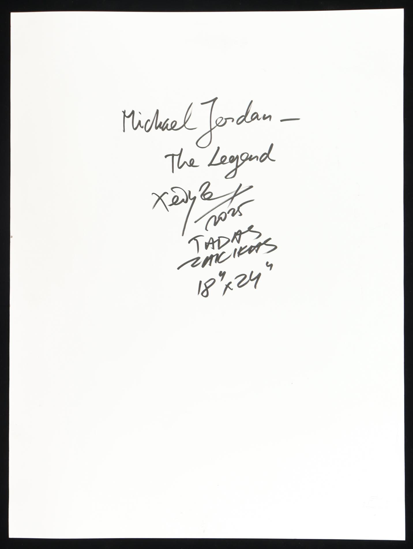 This mixed media piece with acrylic paint on premium 230 GSM paper measures 18" x 24" in size. The piece is titled "Michael Jordan_The Legend" and is hand-signed and titled by the artist, Tadas Zaicikas (TedyZet).