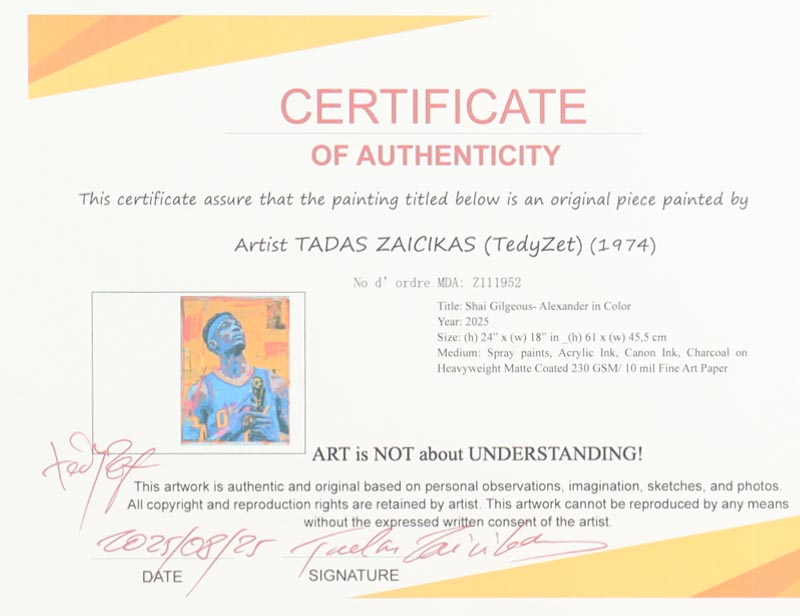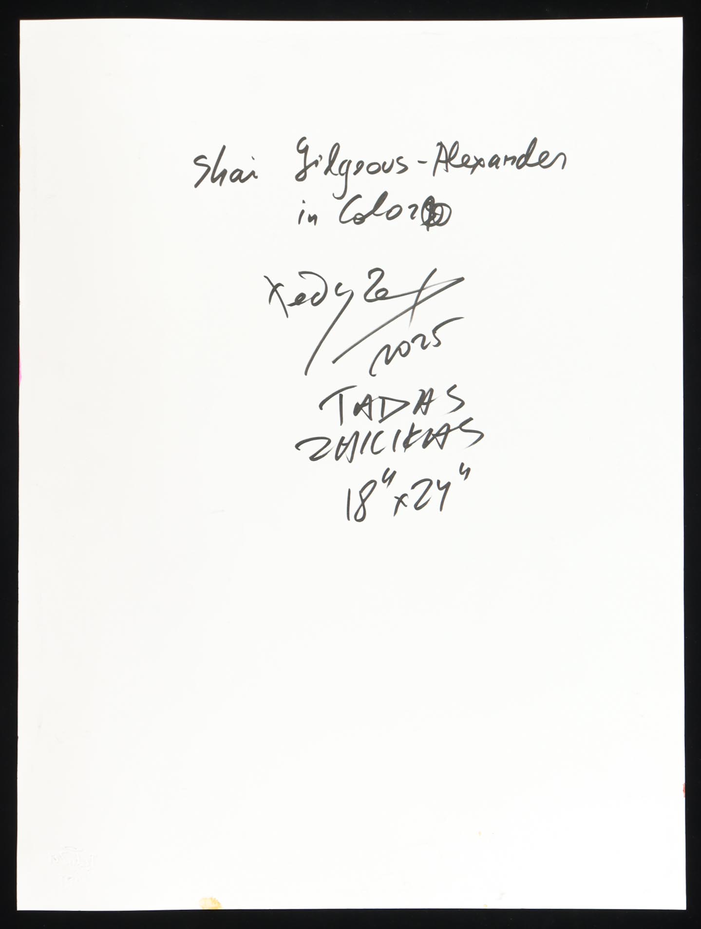 This mixed media piece with acrylic paint on premium 230 GSM paper measures 18" x 24" in size. The piece is titled "Shai Gilgeous- Alexander in Color" and is hand-signed and titled by the artist, Tadas Zaicikas (TedyZet).