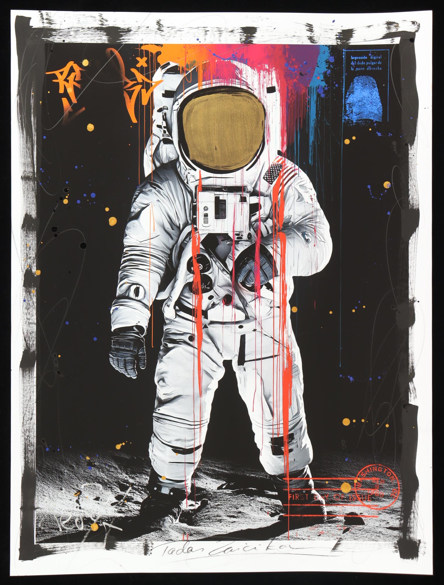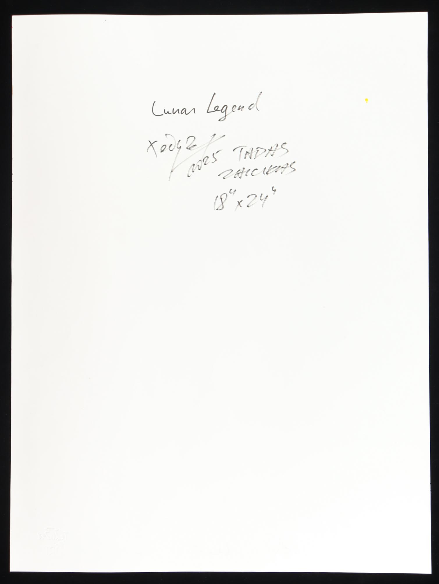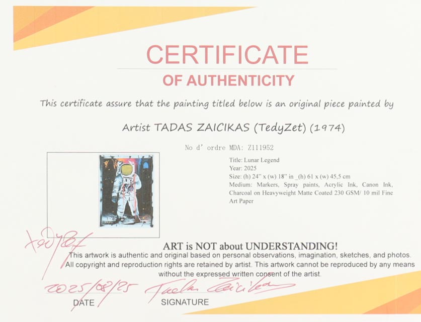 This mixed media piece with acrylic paint on premium 230 GSM paper measures 18" x 24" in size. The piece is titled "Lunar Legend" and is hand-signed and titled by the artist, Tadas Zaicikas (TedyZet).