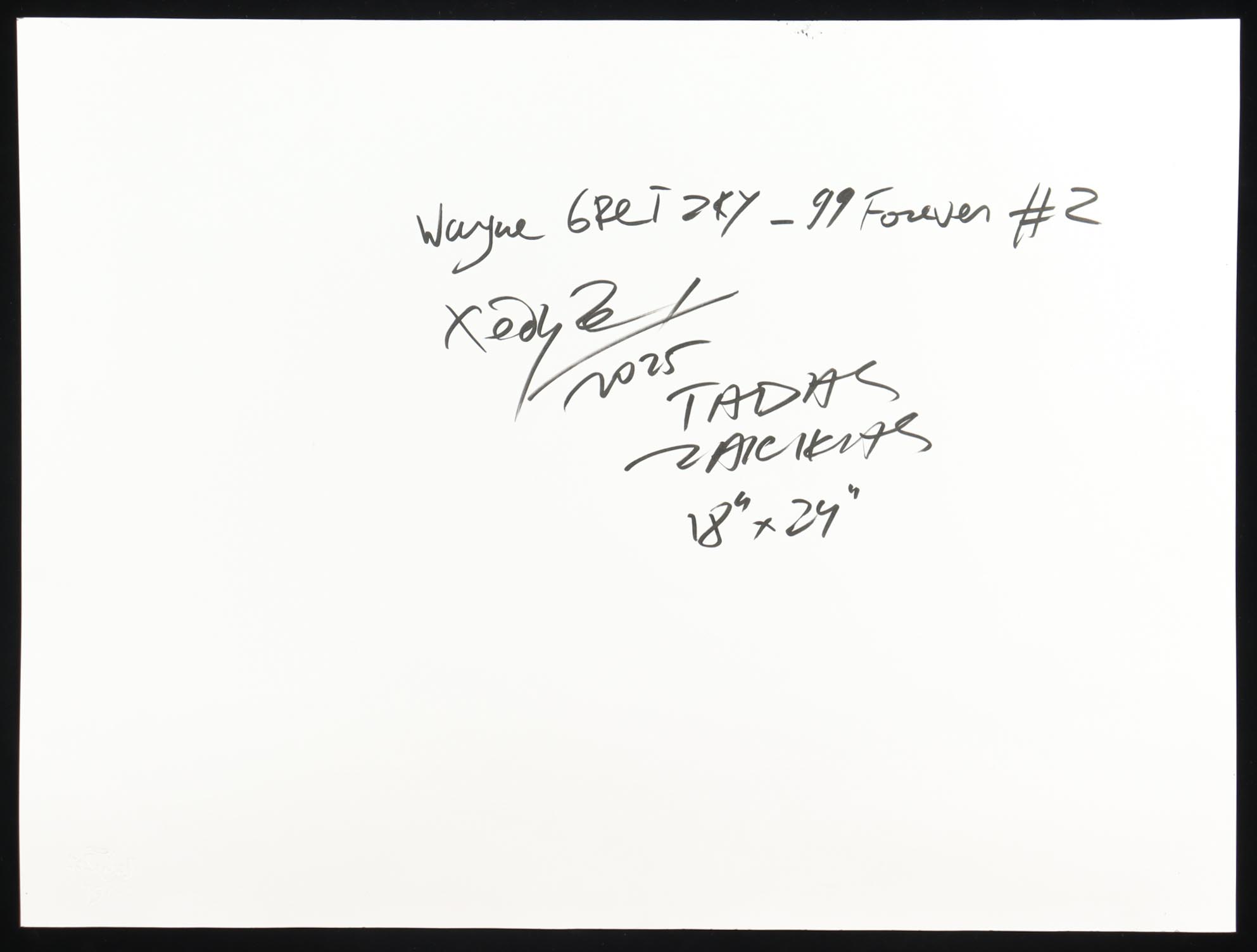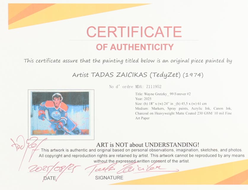 This mixed media piece with acrylic paint on premium 230 GSM paper measures 18" x 24" in size. The piece is titled "Wayne Gretzky_99 Forever #2" and is hand-signed and titled by the artist, Tadas Zaicikas (TedyZet).