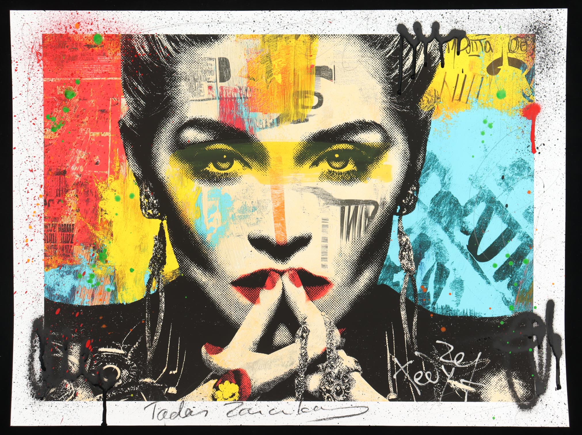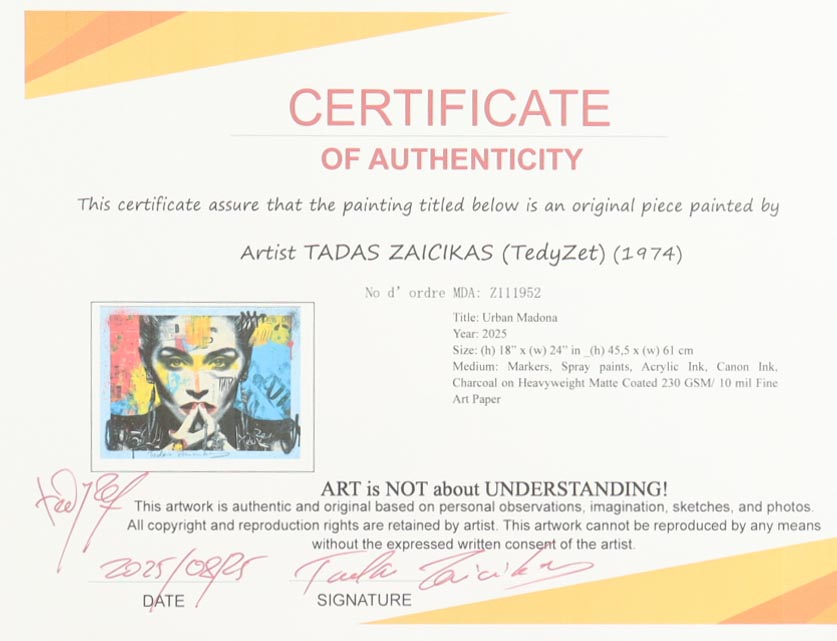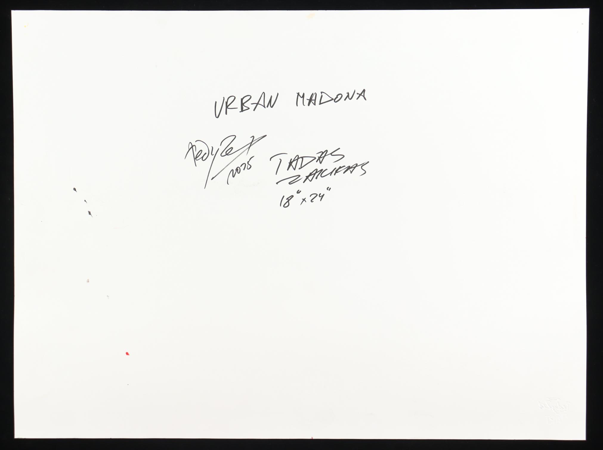 This mixed media piece with acrylic paint on premium 230 GSM paper measures 18" x 24" in size. The piece is titled "Urban Madonna" and is hand-signed and titled by the artist, Tadas Zaicikas (TedyZet).