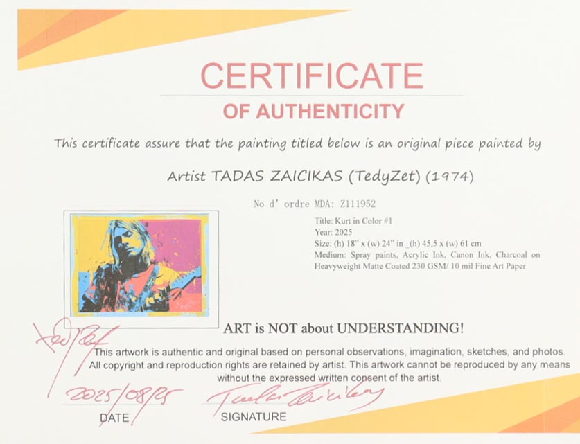 This Mixed Media with acrylic paint on premium 230 GSM paper measures 18" x 24" in size. The piece is titled "Kurt in Color #1" and is hand-signed and titled by the artist, Tadas Zaicikas (TedyZet).