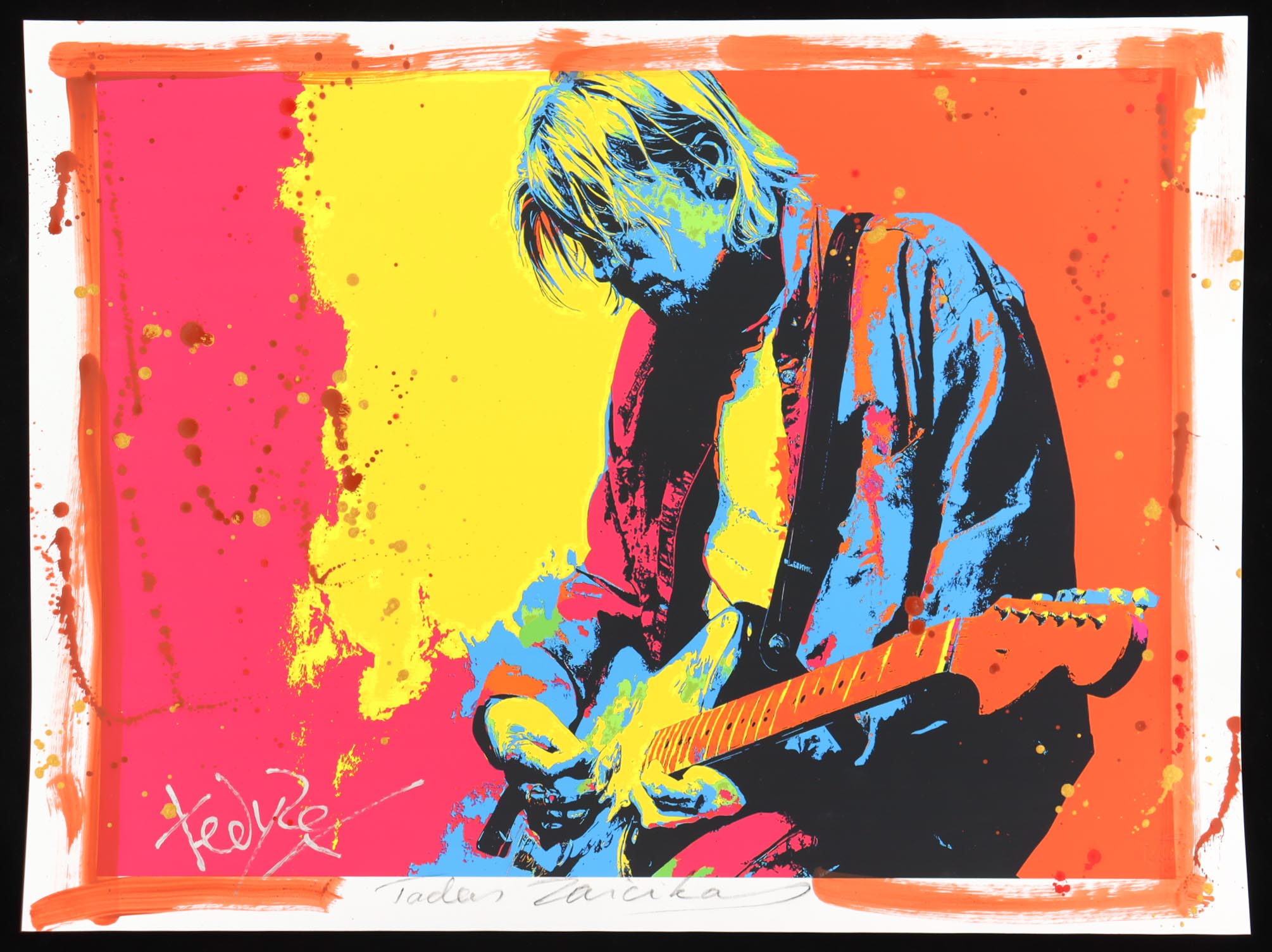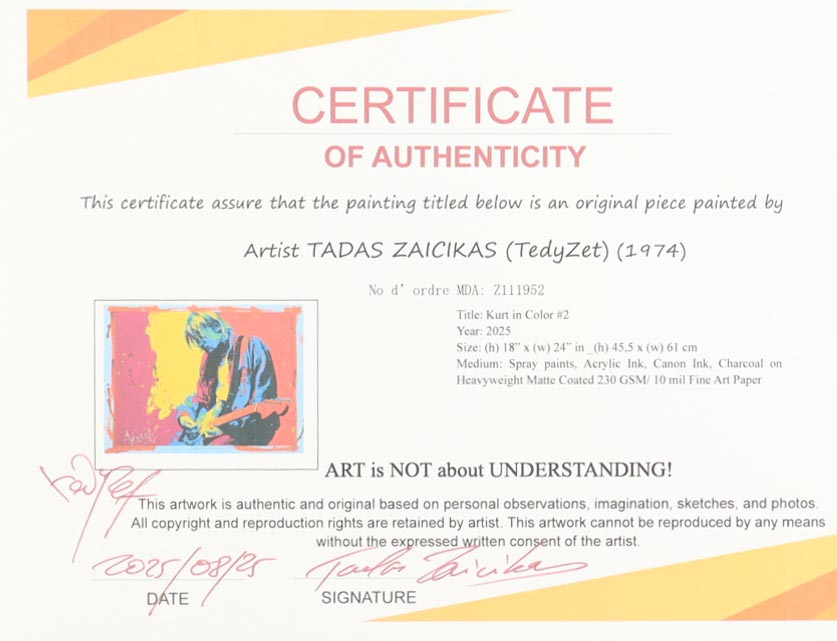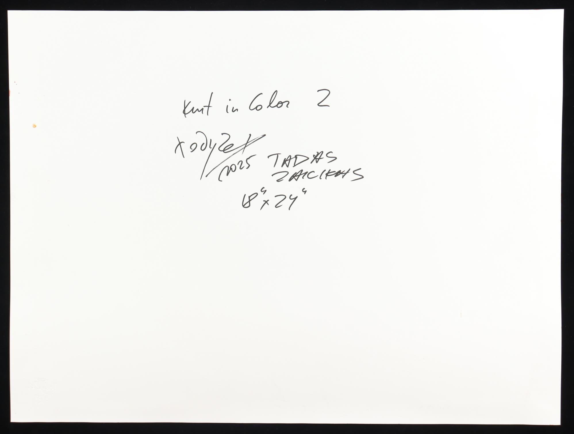 This mixed media piece with acrylic paint on premium 230 GSM paper measures 18" x 24" in size. The piece is titled "Kurt in Color #2" and is hand-signed and titled by the artist, Tadas Zaicikas (TedyZet).