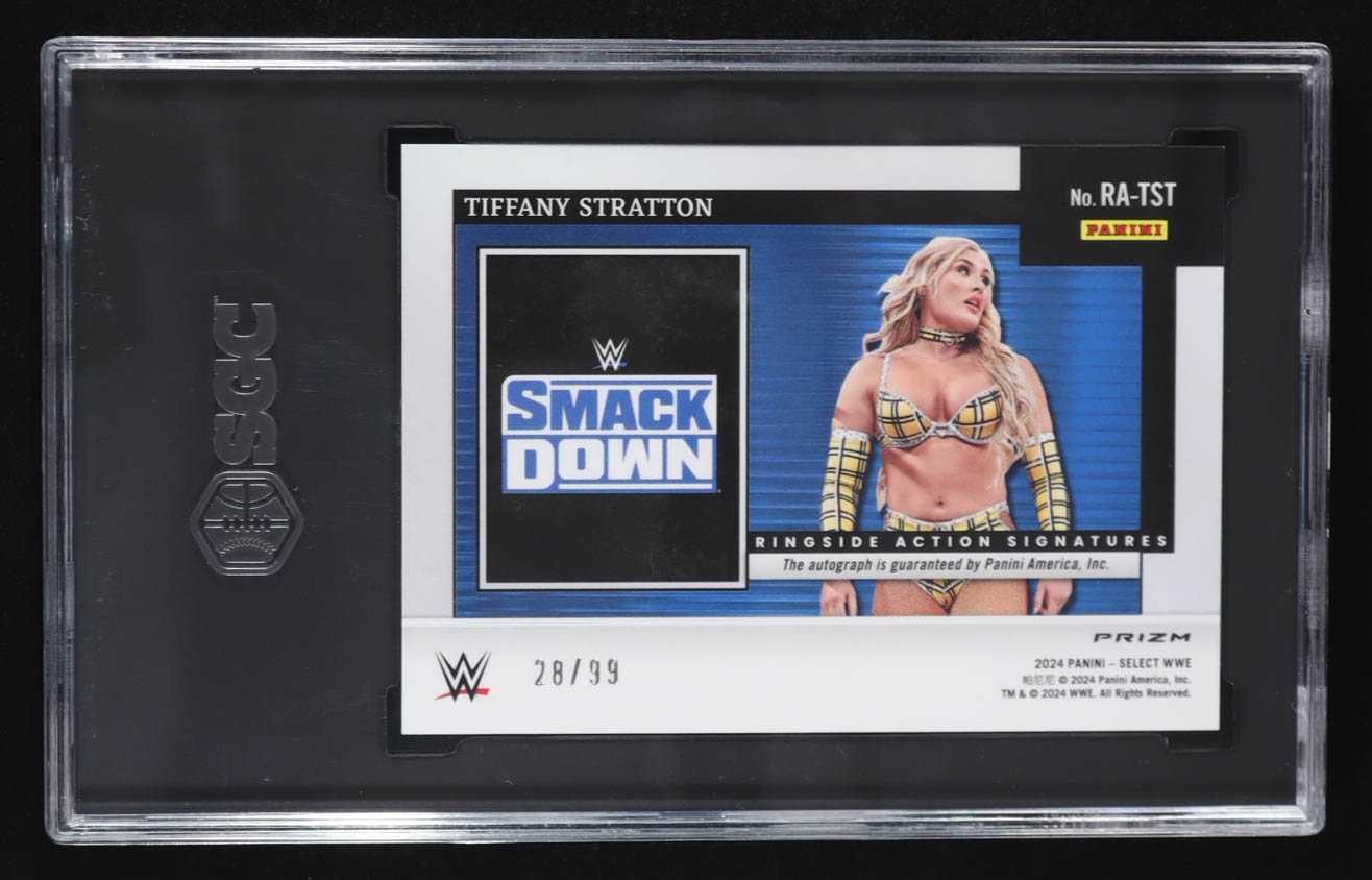 Tiffany Stratton 2024 Select WWE Ringside Action Signatures Red Prizms #RATST #28/99 (SGC 10)