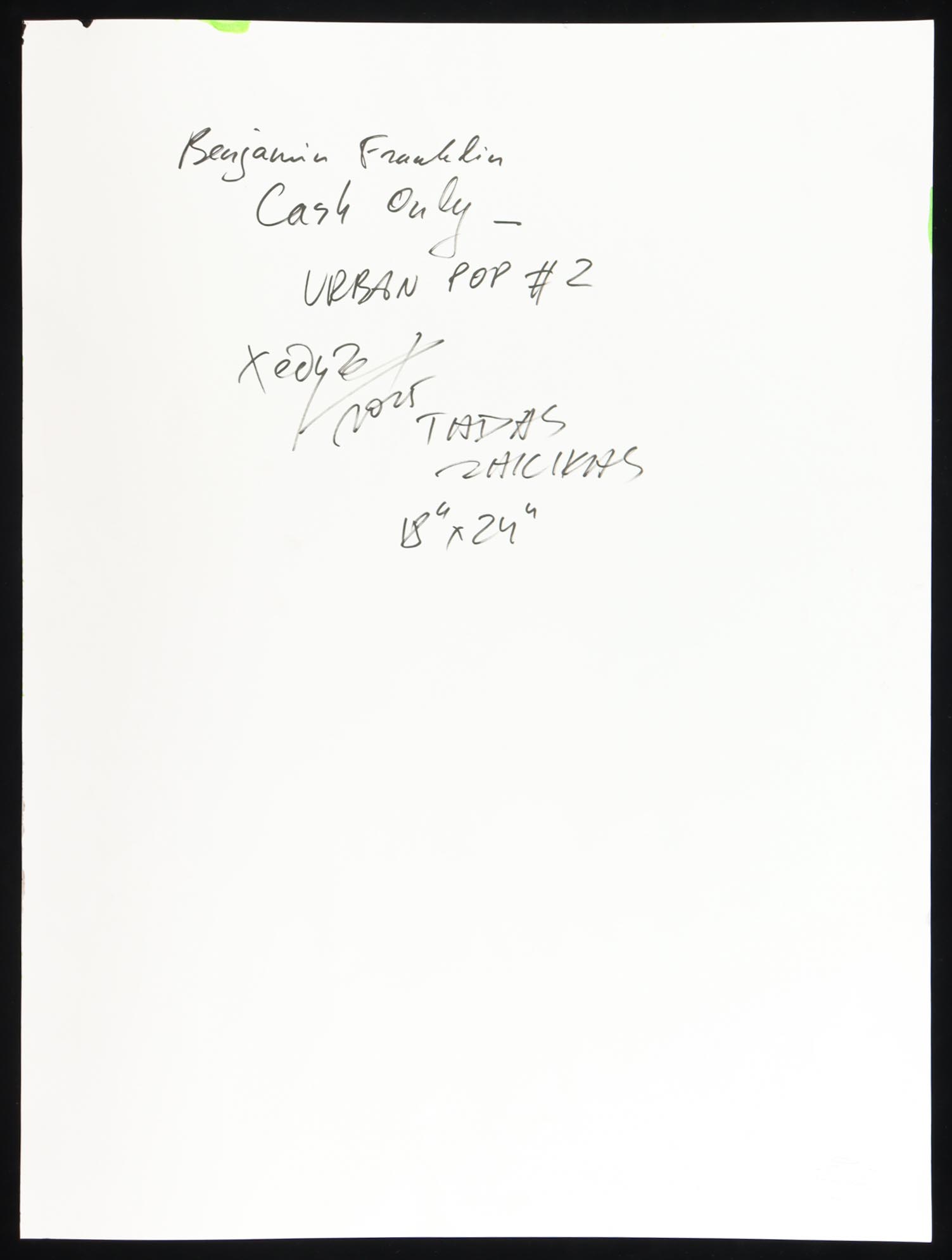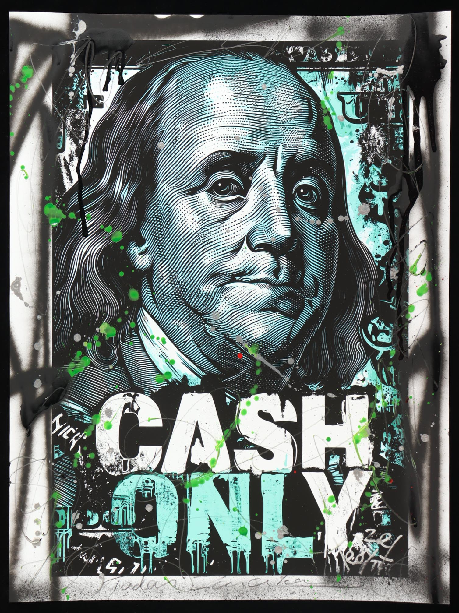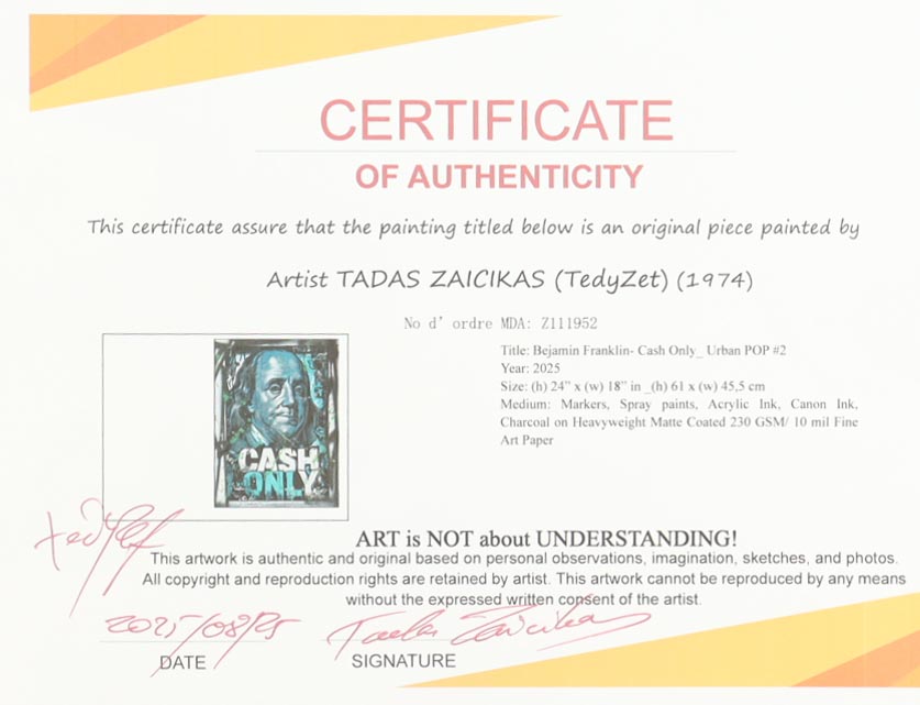 This mixed media piece with acrylic paint on premium 230 GSM paper measures 18" x 24" in size. The piece is titled "Benjamin Franklin- Cash Only_ Urban POP#2" and is hand-signed and titled by the artist, Tadas Zaicikas (TedyZet).