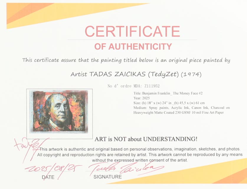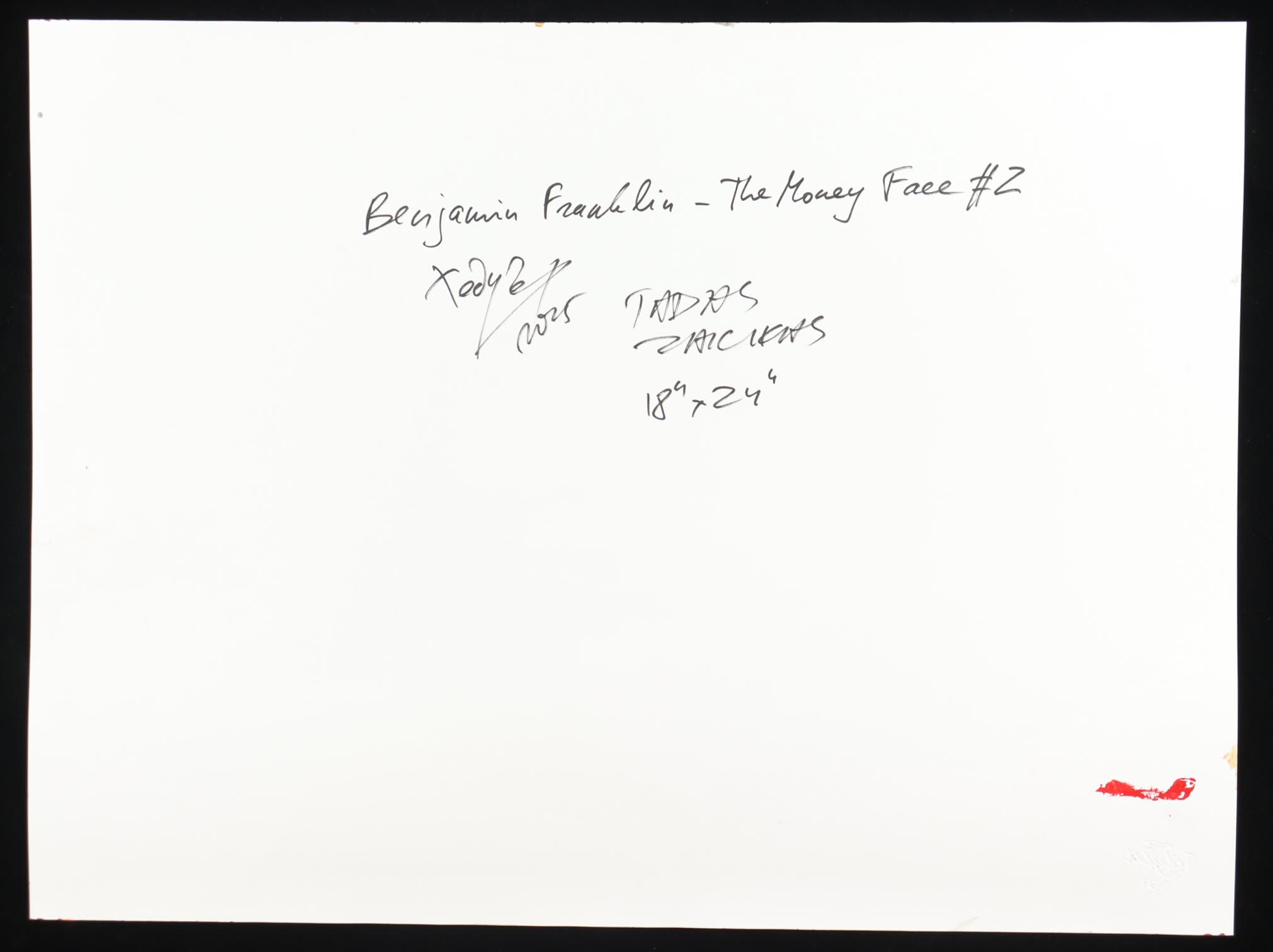 This mixed media piece with acrylic paint on premium 230 GSM paper measures 18" x 24" in size. The piece is titled "Benjamin Franklin_ The Money Face #2" and is hand-signed and titled by the artist, Tadas Zaicikas (TedyZet).