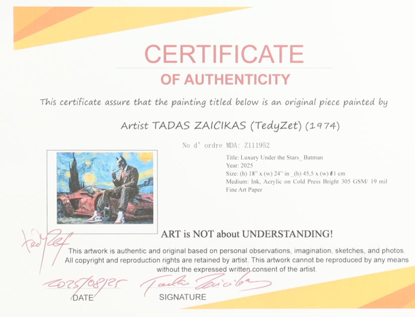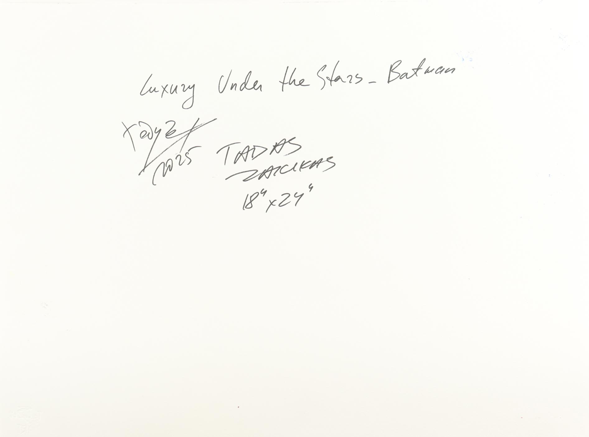 This mixed media piece with acrylic paint on premium 305 GSM paper measures 18" x 24" in size. The piece is titled "Luxury Under The Stars_Batman" and is hand-signed and titled by the artist, Tadas Zaicikas (TedyZet).