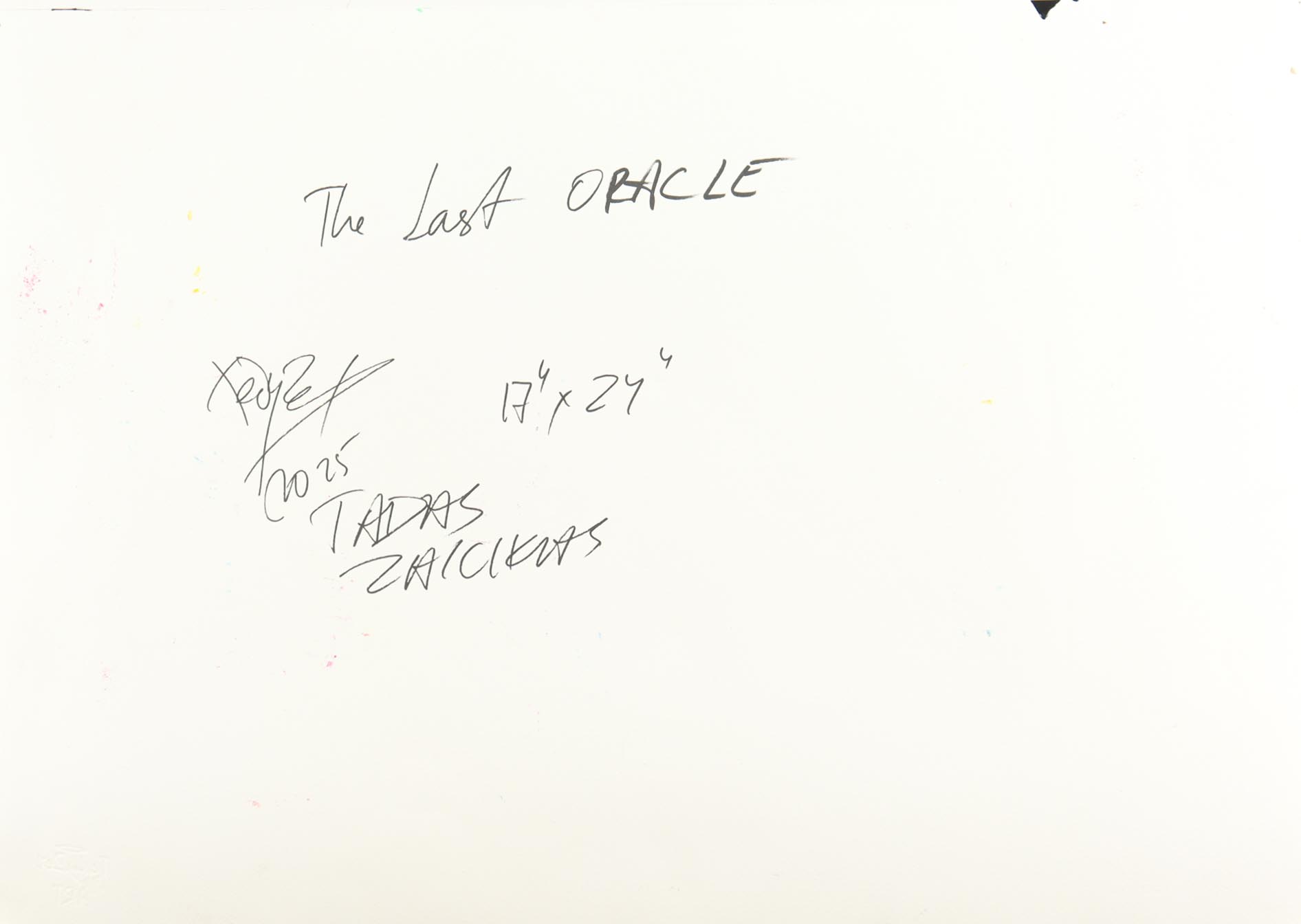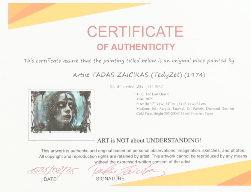 This mixed media piece with acrylic paint on premium 305 GSM paper measures 17" x 24" in size. The piece is titled "The Last Oracle" and is hand-signed and titled by the artist, Tadas Zaicikas (TedyZet).