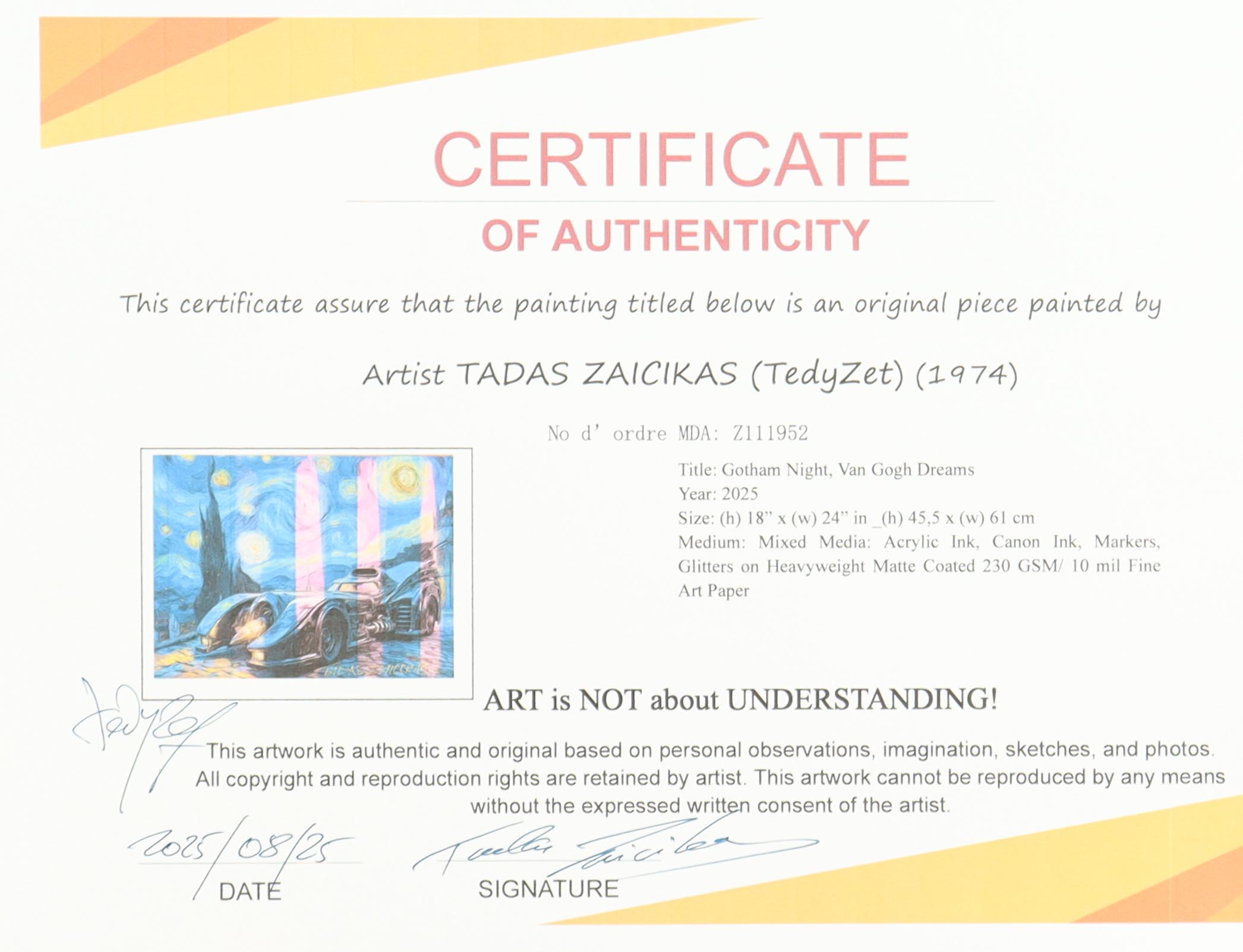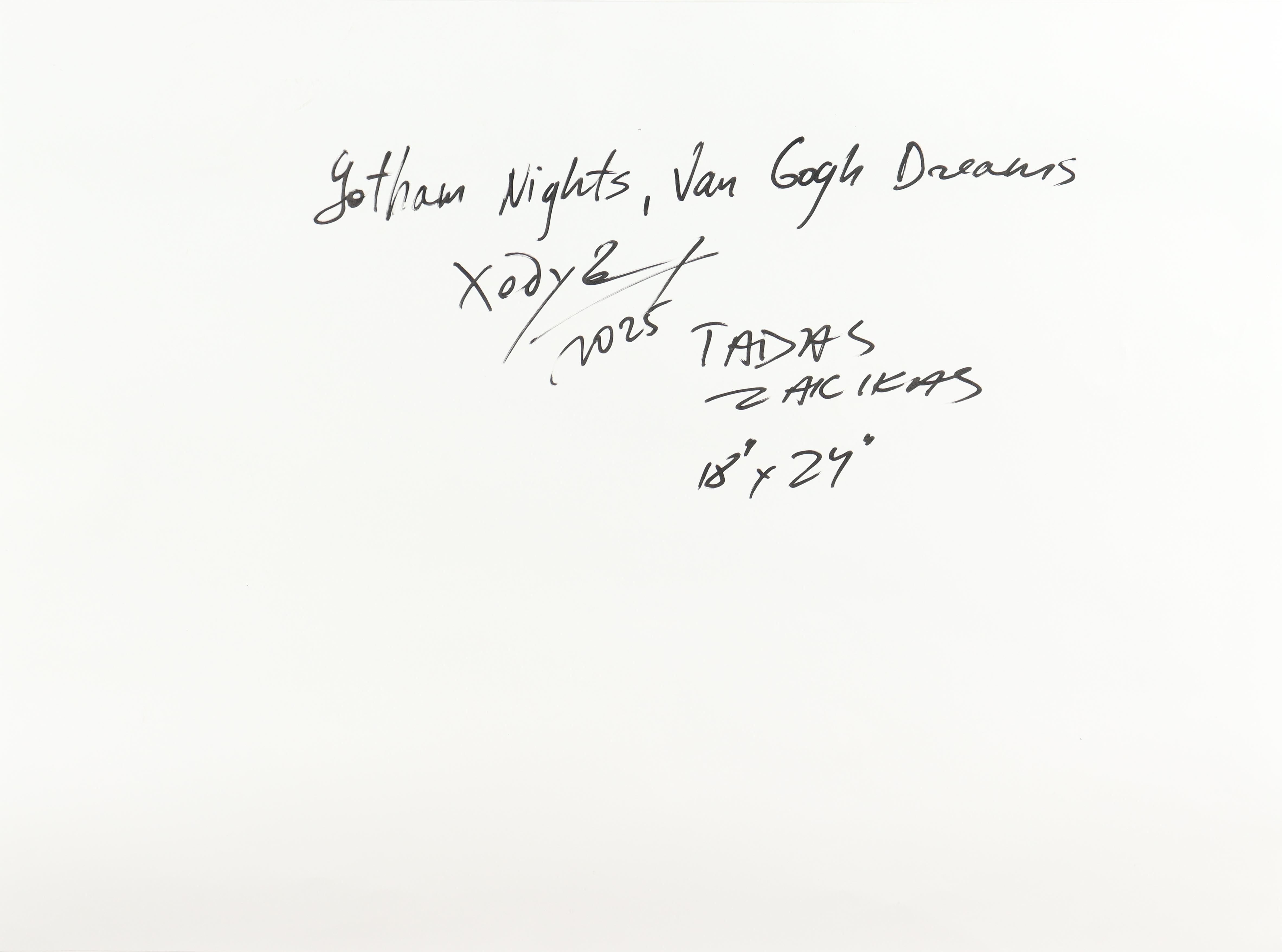 This mixed media piece with acrylic paint on premium 230 GSM paper measures 18" x 24" in size. The piece is titled "Gotham Night, Van Gogh Dreams" and is hand-signed and titled by the artist, Tadas Zaicikas (TedyZet).