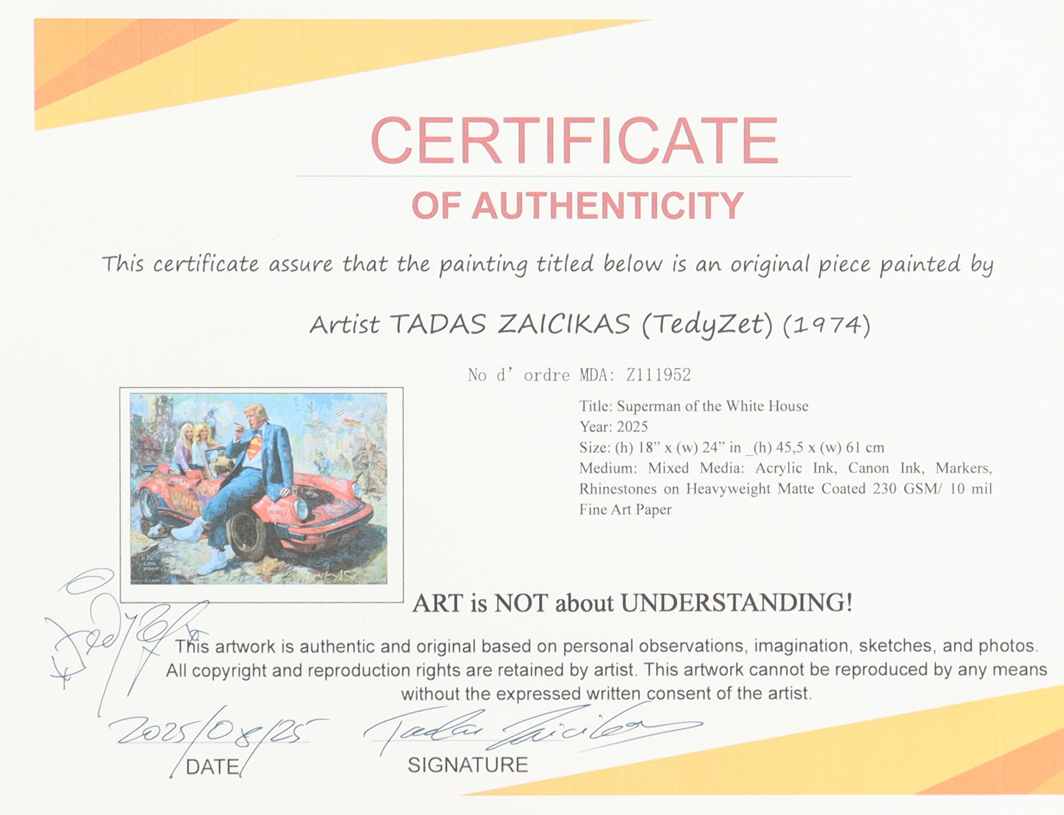 This mixed media piece with acrylic paint on premium 230 GSM paper measures 18" x 24" in size. The piece is titled "Superman of the White House" and is hand-signed and titled by the artist, Tadas Zaicikas (TedyZet).