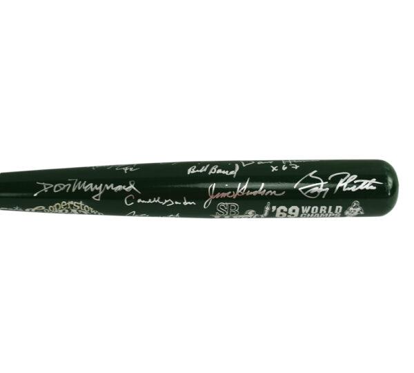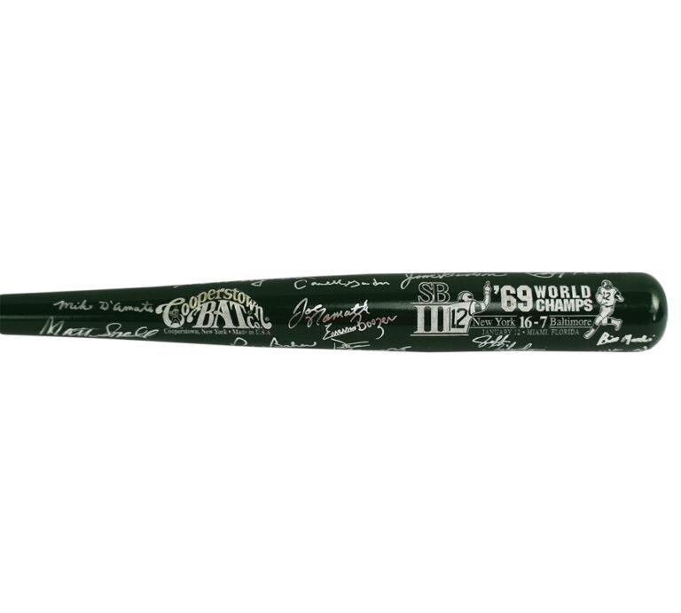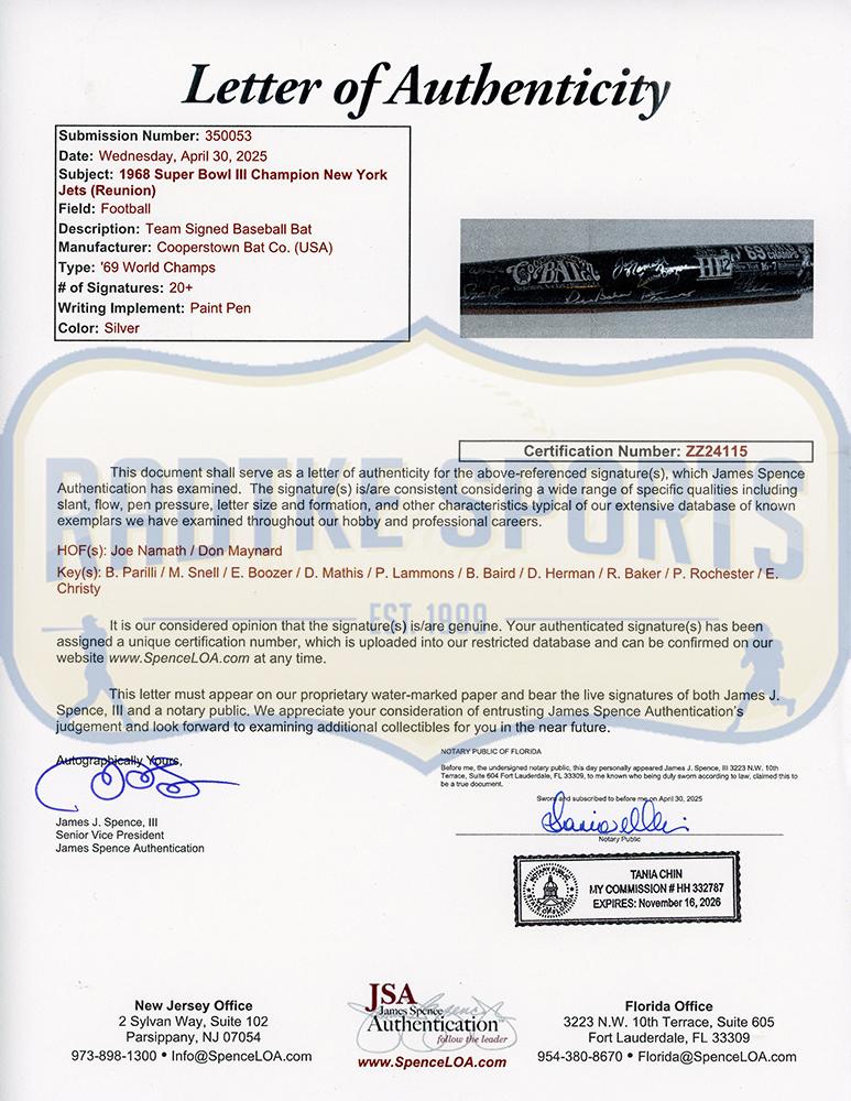 Cooperstown Custom baseball bat has been hand-signed by (25) members of the 1969 New York Jets! Signers include Joe Namath, Don Maynard, Babe Parilli, Matt Snell, Emerson Boozer, Bill Mathis, Pete Lammons, Bill Baird, Dave Herman, Ralph Baker, Paul Rochester, Earl Christy and (13) others.