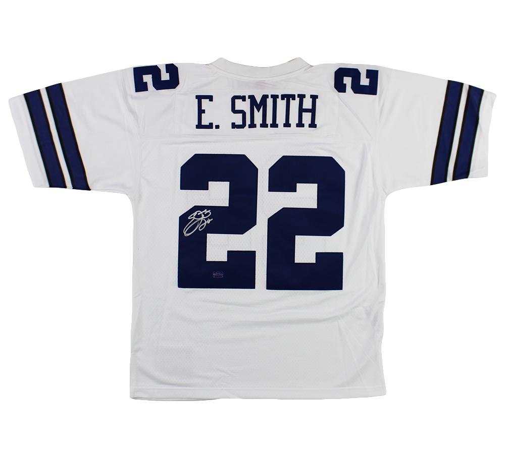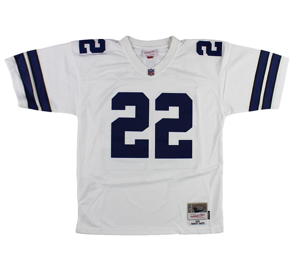 Mitchell & Ness jersey with everything sewn on, size XL. Hand-signed by Emmitt Smith (Dallas Cowboys, HOF).