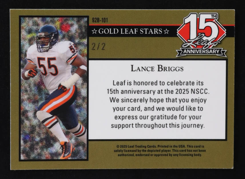 Lance Briggs 2025 Leaf 15th Anniversary '92 Gold Leaf Stars Lazer Black #92B101 #2/2