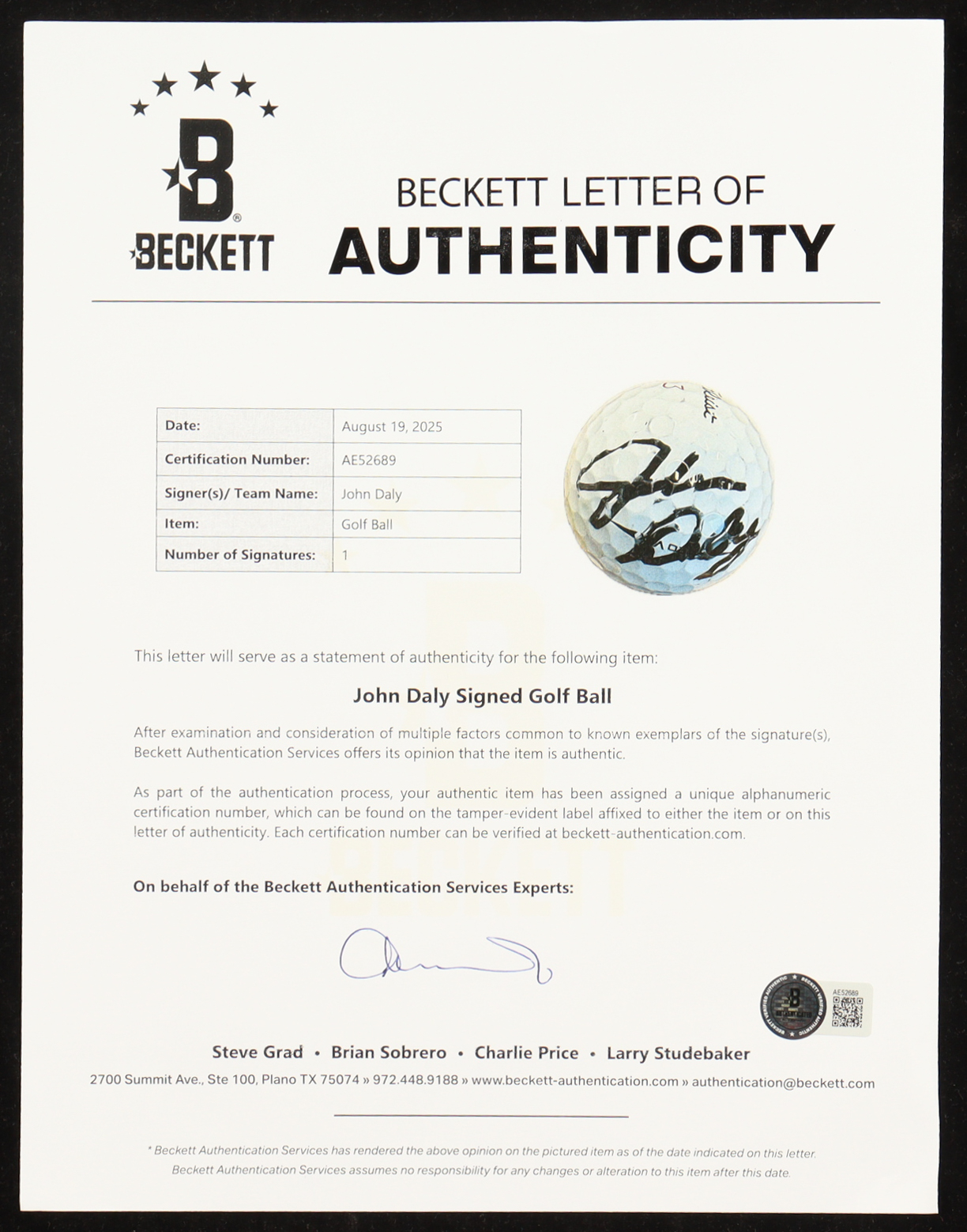 The autograph includes an official Beckett Authentication Services hologram and matching LOA for authenticity purposes.