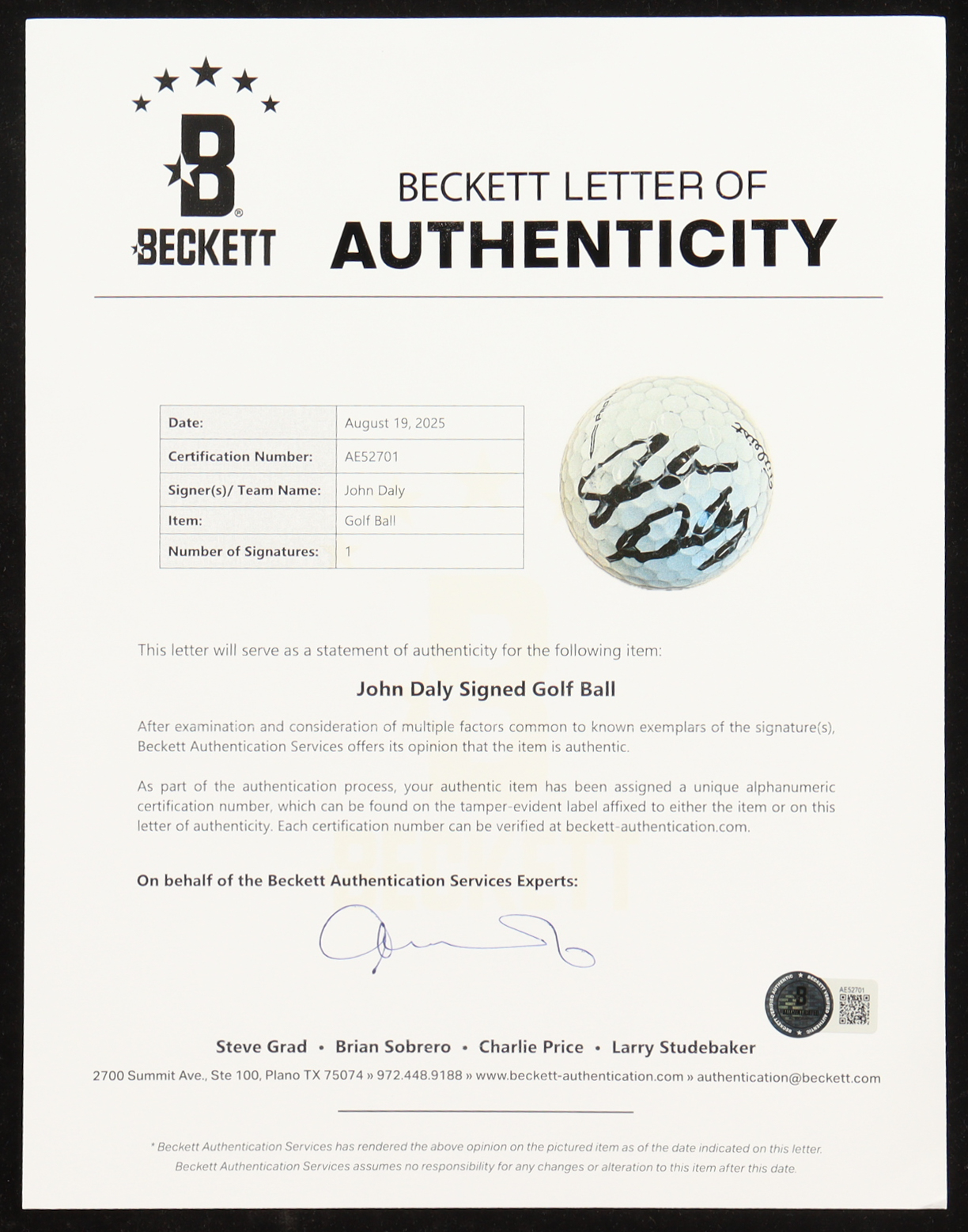 The autograph includes an official Beckett Authentication Services hologram and matching LOA for authenticity purposes.