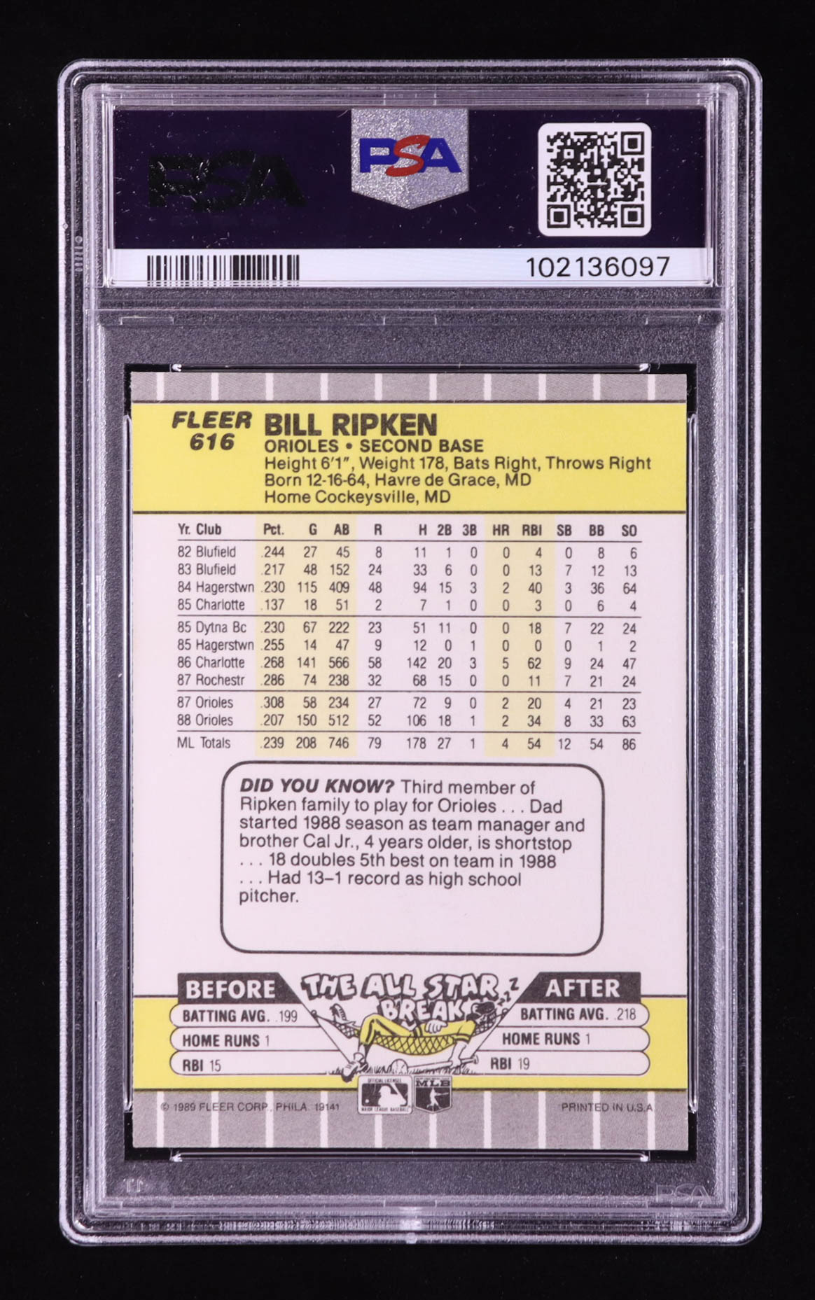 Bill Ripken 1989 Fleer #616E DP / Black Box Covering Bat Knob (PSA 9)