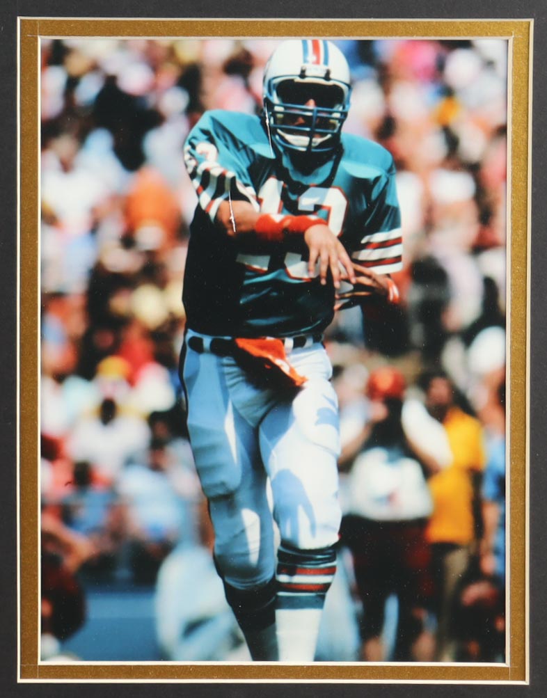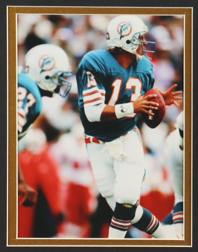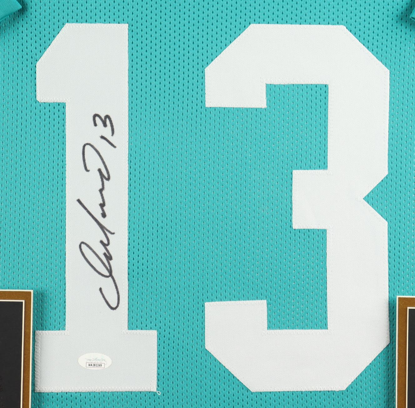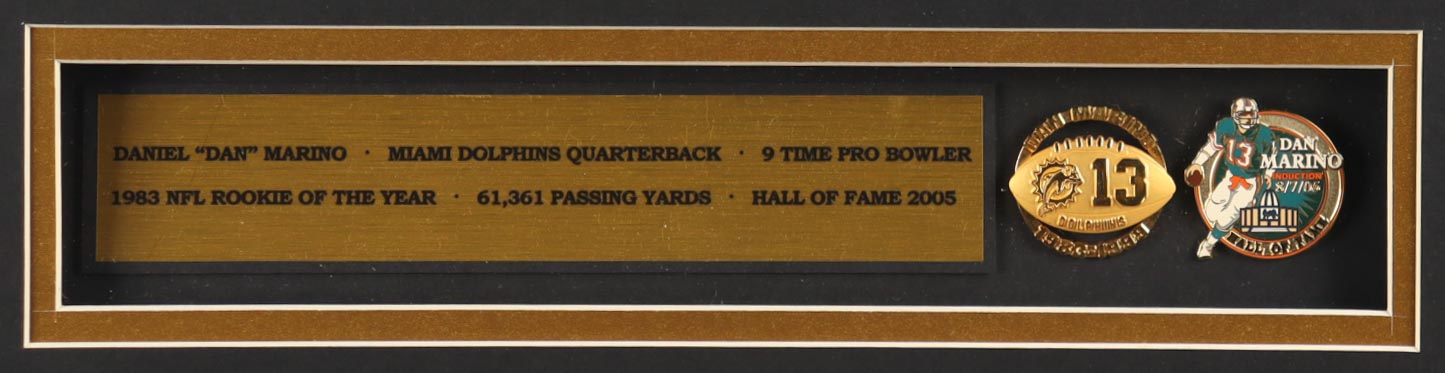 Custom frame measures 32" x 36" in size. Features a jersey that has been hand-signed Dan Marino (Miami Dolphins, HOF). Includes a Dolphins #13 Retirement Emblem, Hall of Fame induction pin, (2) 8" x 10" photos, and (2) Miami Dolphins logo patches as well as a full career statistics plaque.