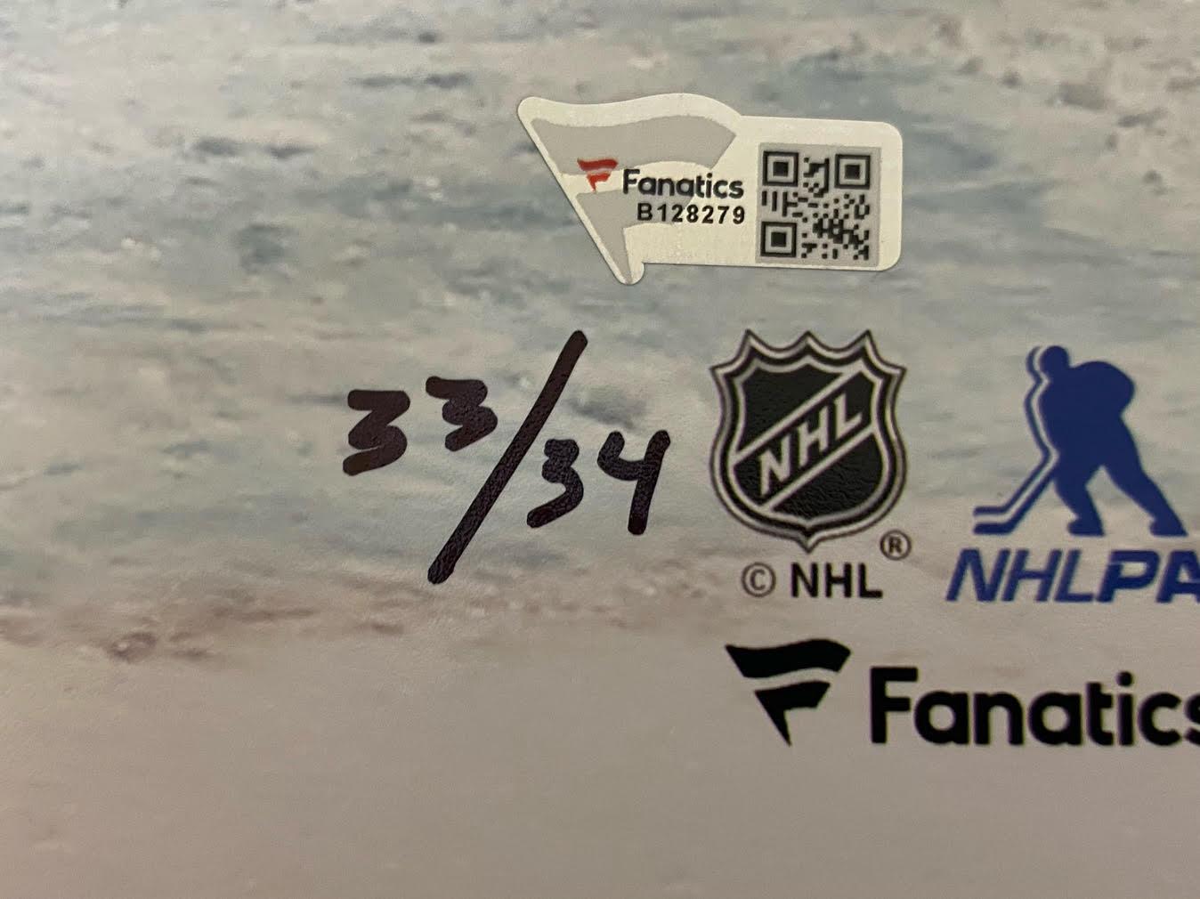 Photo measures 16" x 20" in size and has been hand-signed and inscribed by Kaapo Kahkonen (Minnesota Wild). Hand-numbered limited edition #/34.