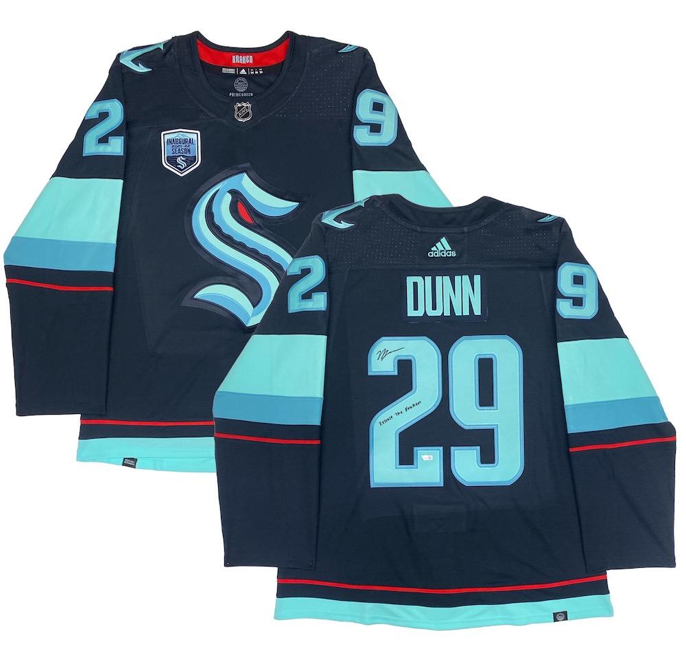 Adidas jersey. Everything sewn on, size 54. Hand-signed and inscribed by Vince Dunn (Seattle Kraken).