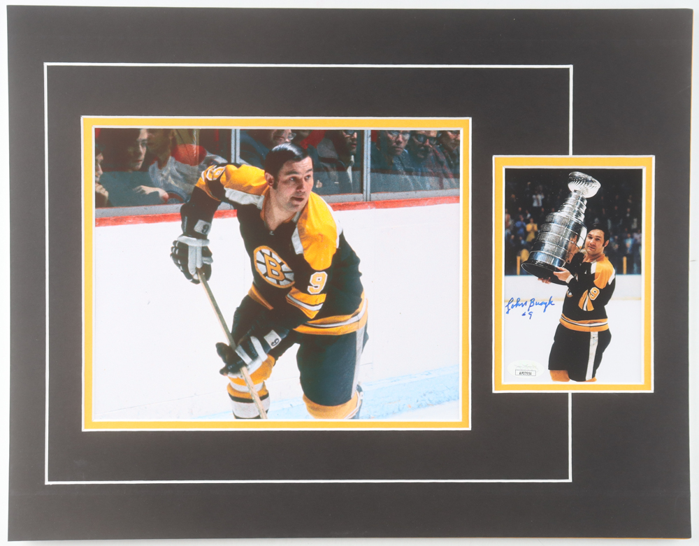 Custom display measures 14" x 18" in size and features a photo that has been hand-signed by Johnny Bucyk (Boston Bruins, HOF).