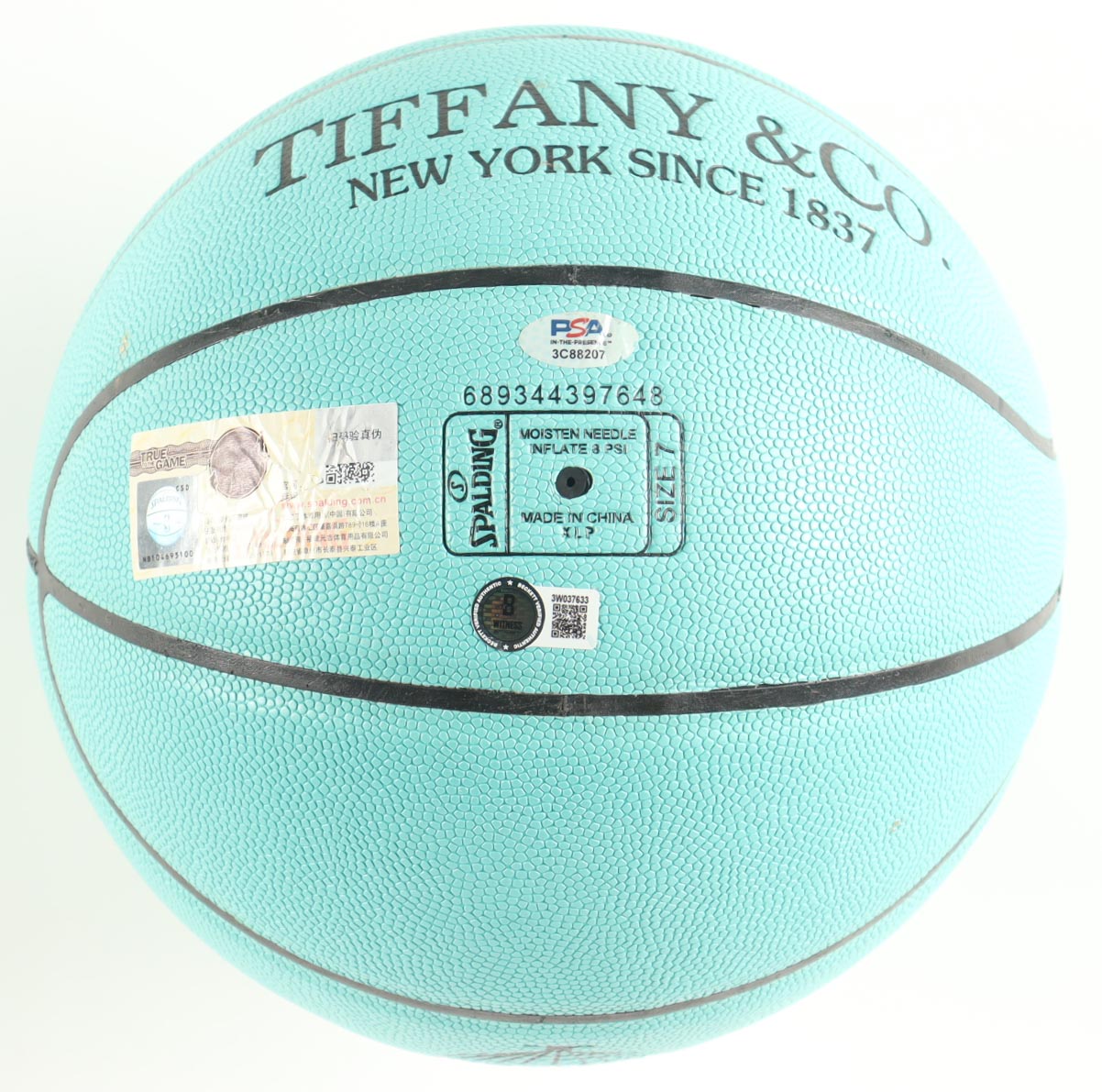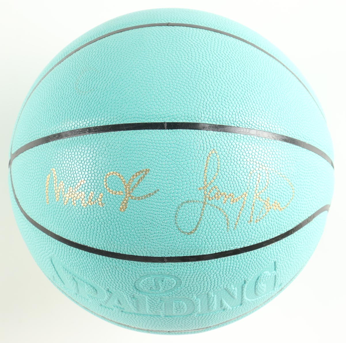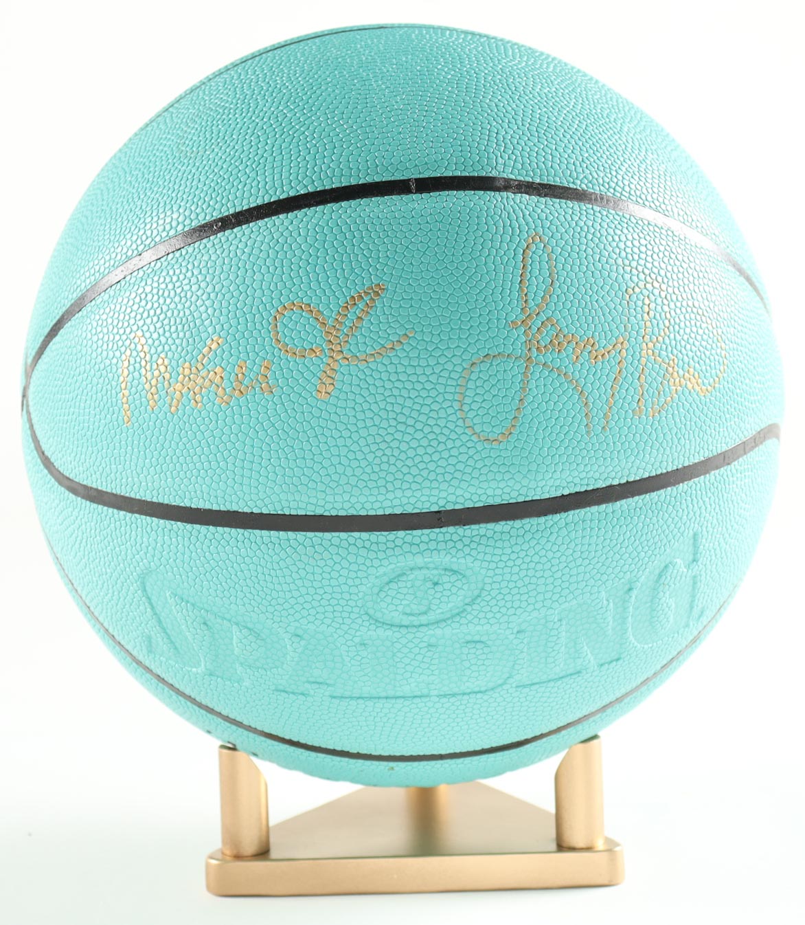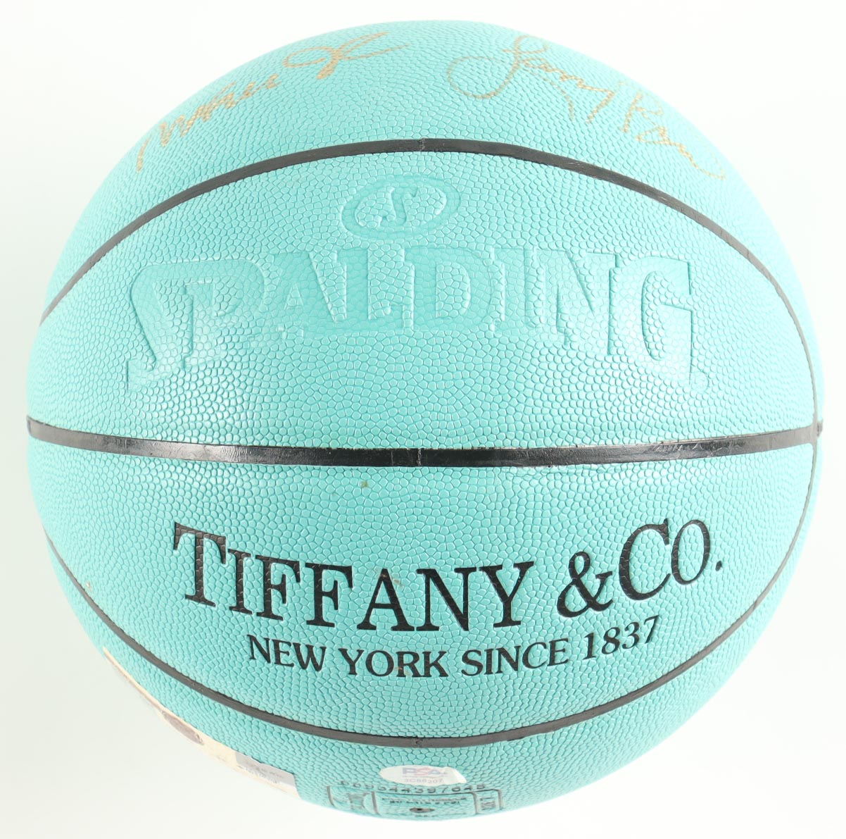 Tiffany & Co. and Spalding collaboration basketball. Hand-signed by Larry Bird (Boston Celtics, HOF) and Magic Johnson (Los Angeles Lakers, HOF). Includes stand as shown.