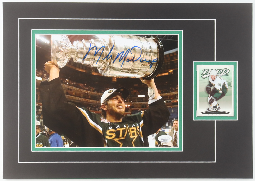 Custom display measures approximately 12" x 17" in size and features a photo that has been hand-signed by Mike Modano (Dallas Stars, HOF). The display also features a 2003-04 Upper Deck MVP #127 Trading Card.
