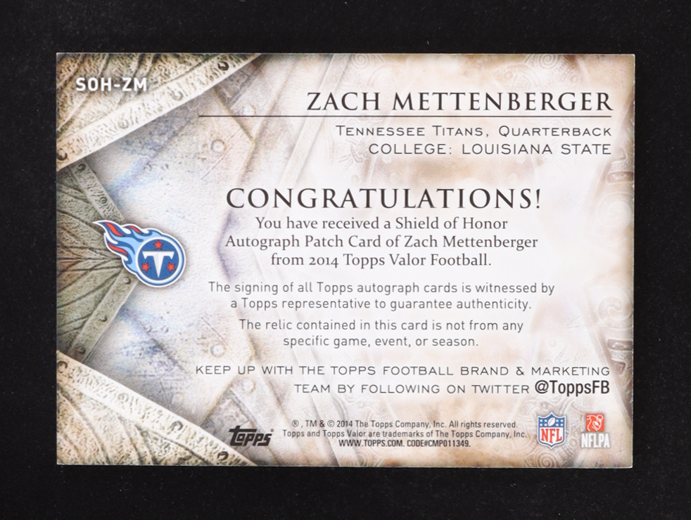 Zach Mettenberger 2014 Topps Valor Shield of Honor Patch Autographs #SOHZM RC