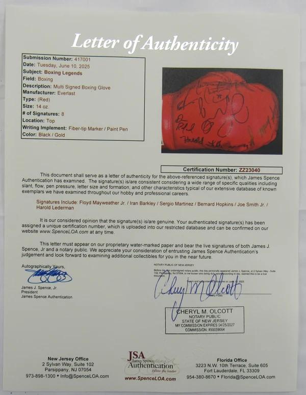 Everlast boxing glove has been hand-signed by (6) boxing legends including Floyd Mayweather Jr., Iran Barkley, Sergio Martinez, Bernard Hopkins, Joe Smith Jr., and Harold Lederman.