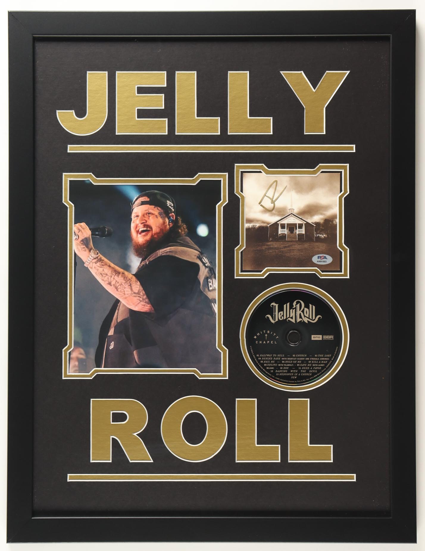 Custom frame measures approximately 20" x 26" in size. Features a "Whitsitt Chapel" CD album insert that has been hand-signed by Jelly Roll. The display also includes the disc as shown.