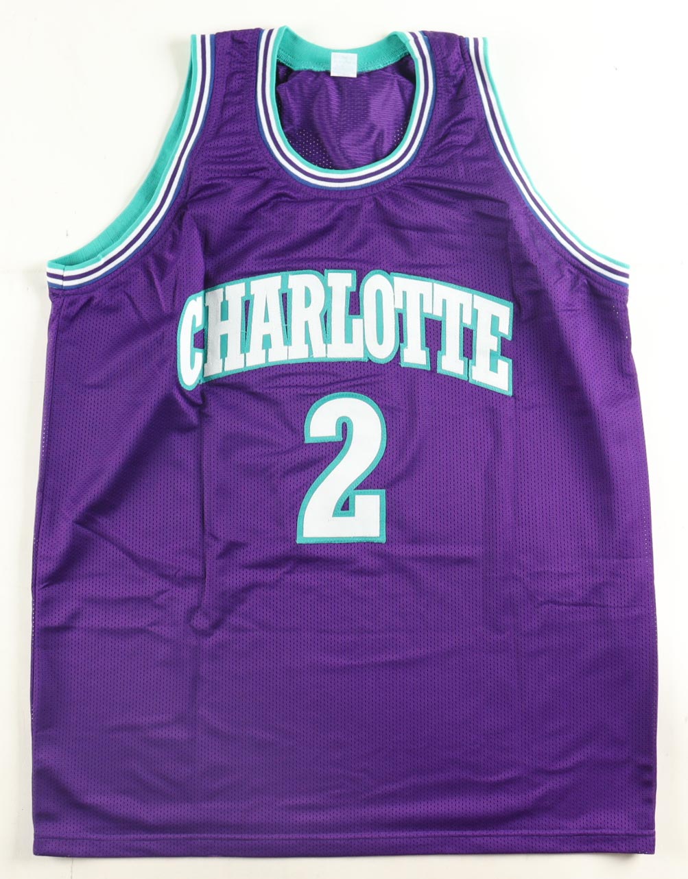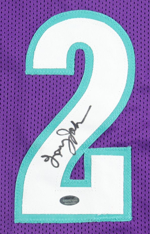 Custom jersey with everything sewn on, size XL. Hand-signed by Larry Johnson.