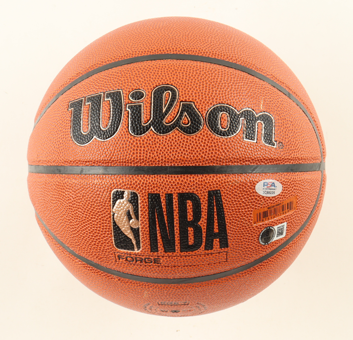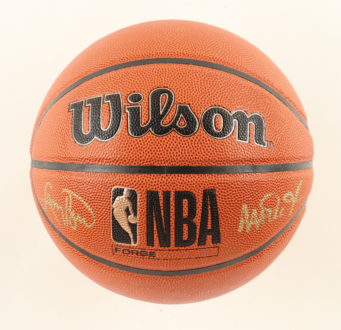 Wilson NBA Forge basketball With Display Stand has been hand-signed by Larry Bird (Boston Celtics, HOF) & Magic Johnson (Los Angeles Lakers, HOF) with NBA Finals plaque. Display is included as shown.