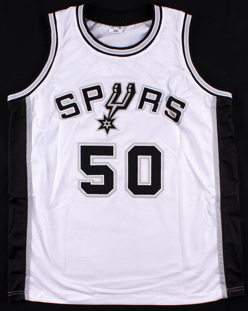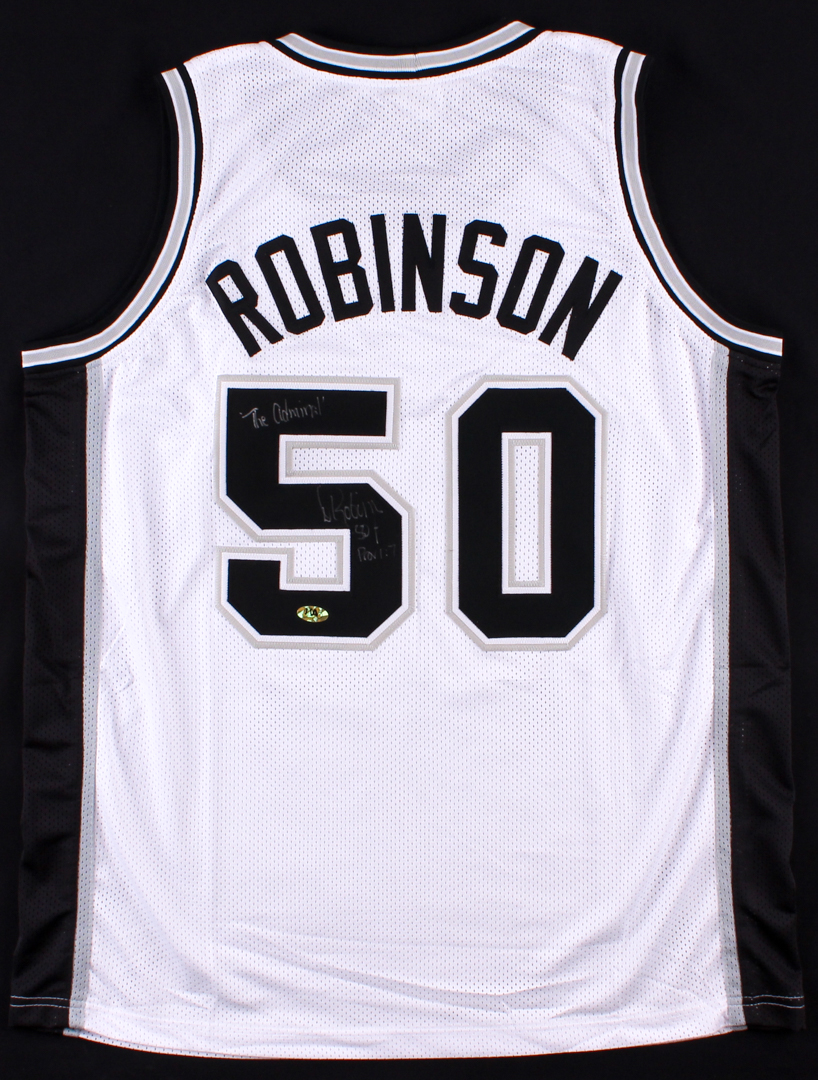 Custom on-court style jersey. Everything sewn on, size XL. Hand-signed in silver paint pen by David Robinson (HOF).