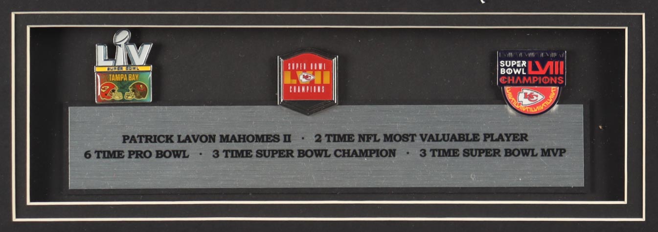 Patrick Mahomes Custom Framed Jersey Display with (3) Super Bowl Pins & Stat Plaque