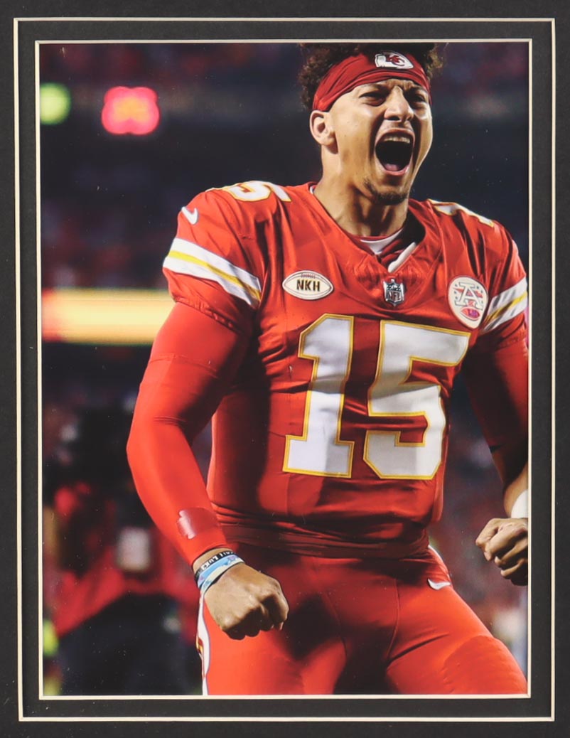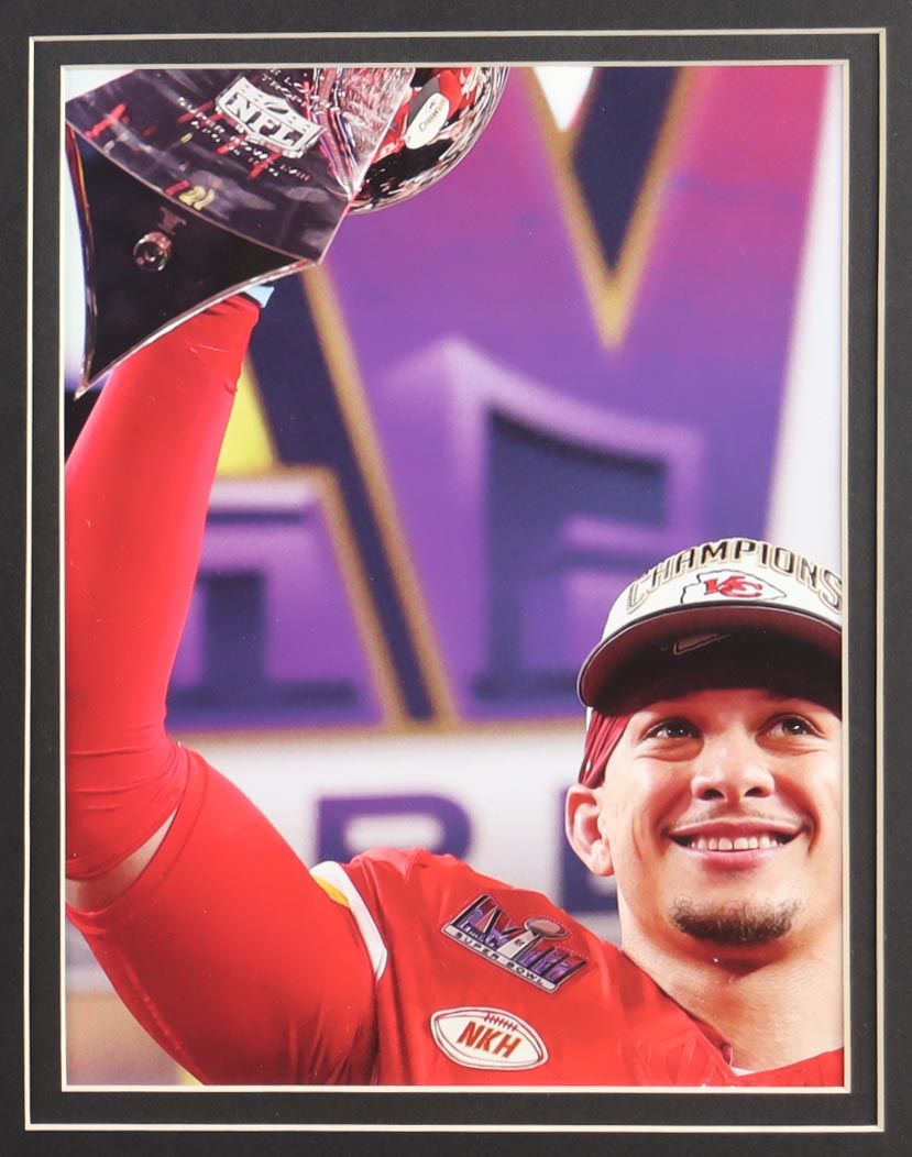 Custom frame display measures approximately 32" x 36" in size and features a unsigned jersey of Patrick Mahomes. The display also includes (3) Super Bowl LIV, LVII, and LVIII pins, (2) 8" x 10" photos, (2) Chiefs cloth logo patches and a full Mahomes areer statistics plaque. Please note that the item is unsigned.