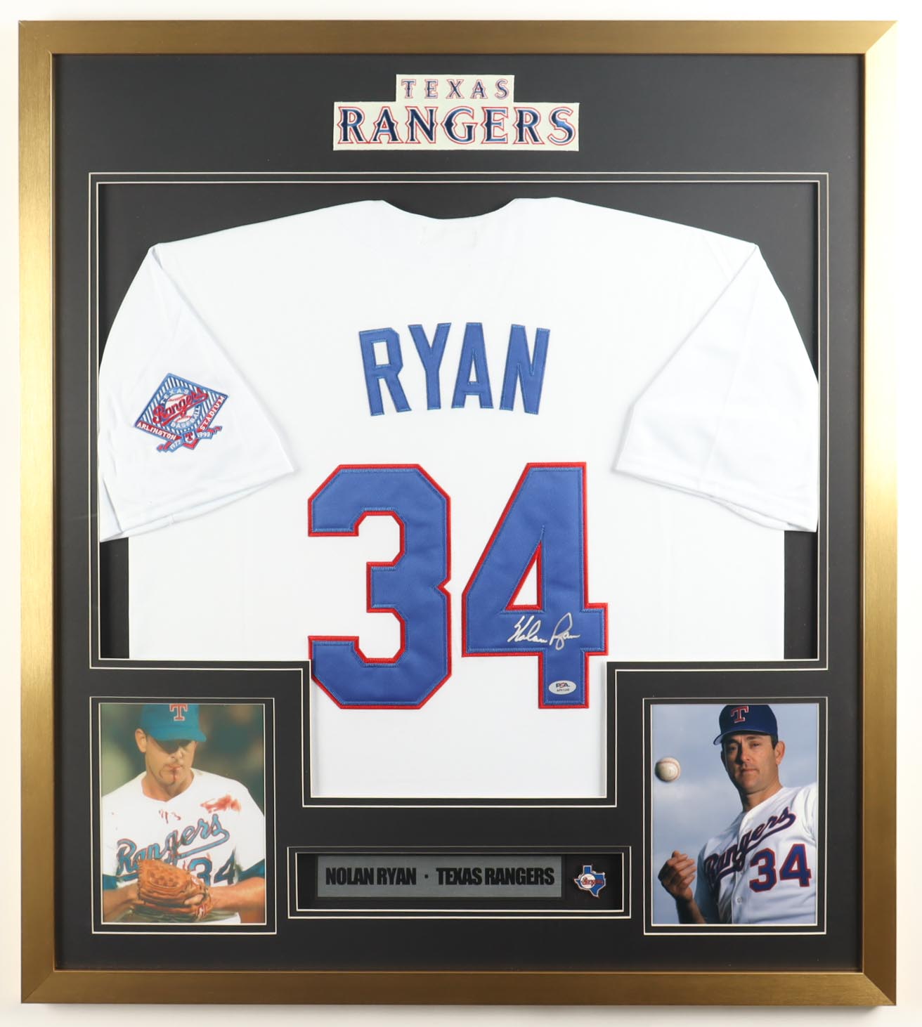 Nolan Ryan Signed Custom Framed Jersey Display with Rangers Logo Pin & Vintage Rangers Patch (PSA)