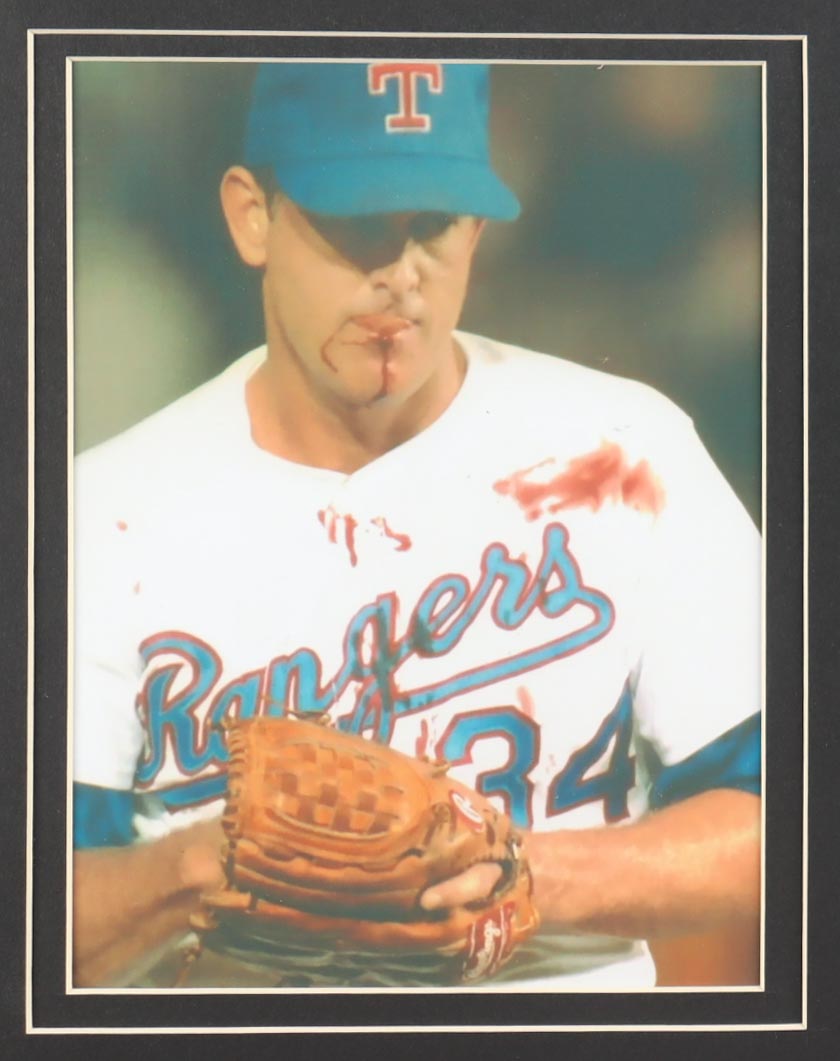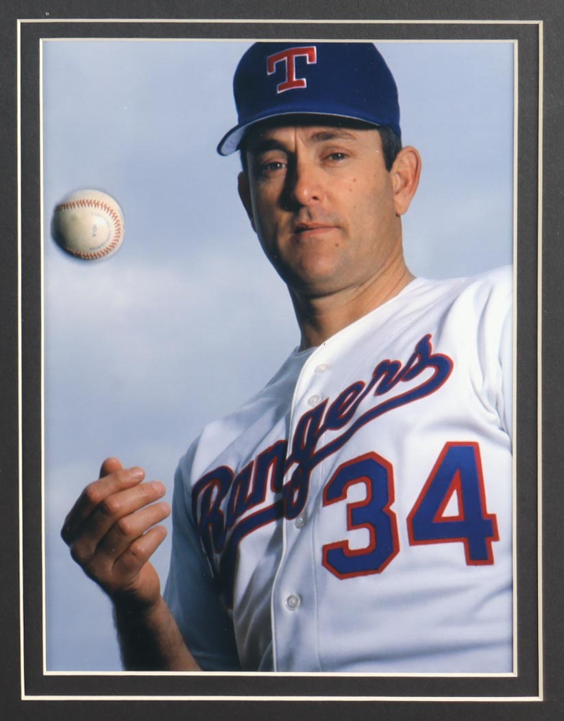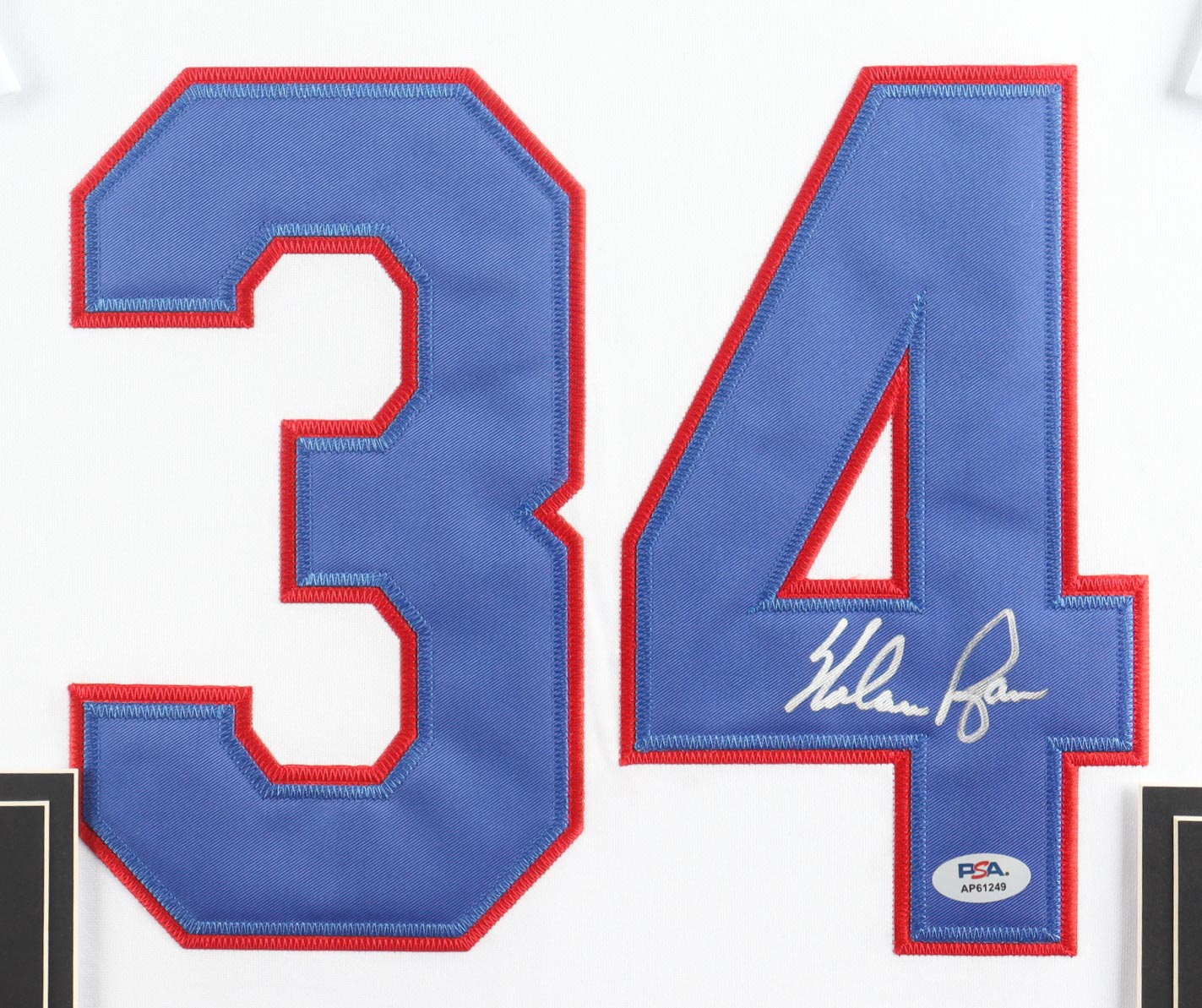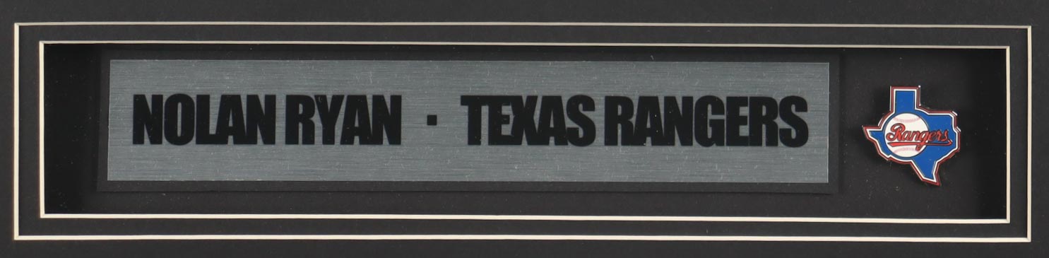 Custom frame display measures approximately 32" x 36" in size and features a jersey that has been hand-signed by Nolan Ryan (Texas Rangers, HOF). The display also includes a Texas Ranges Logo Pin, (2) 8" x 10" photos, vintage Texas Rangers large cloth patch and a Ryan title plaque.