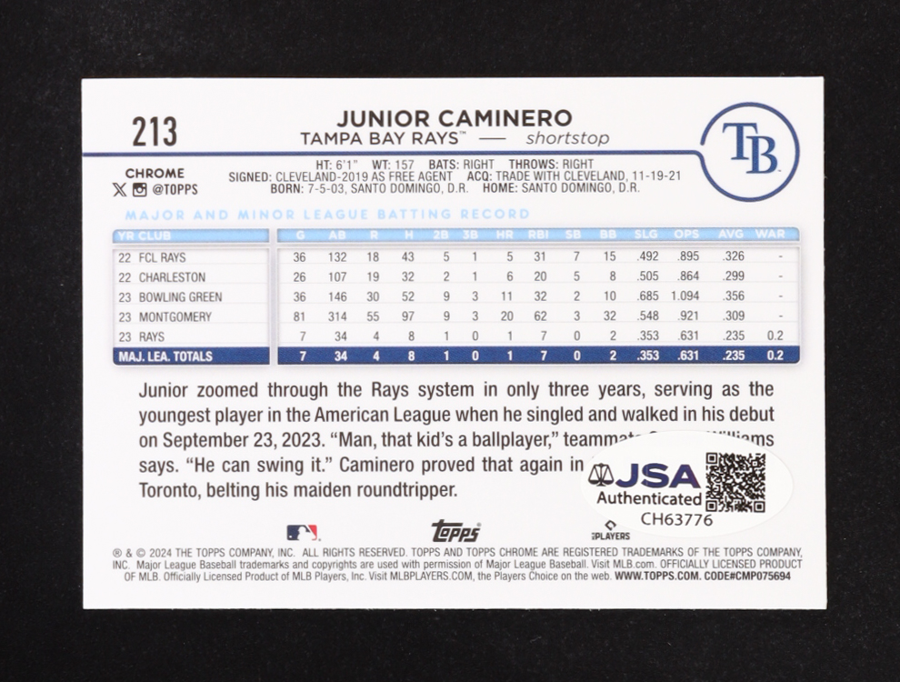Junior Caminero Signed 2024 Topps Chrome #213 RC (JSA)