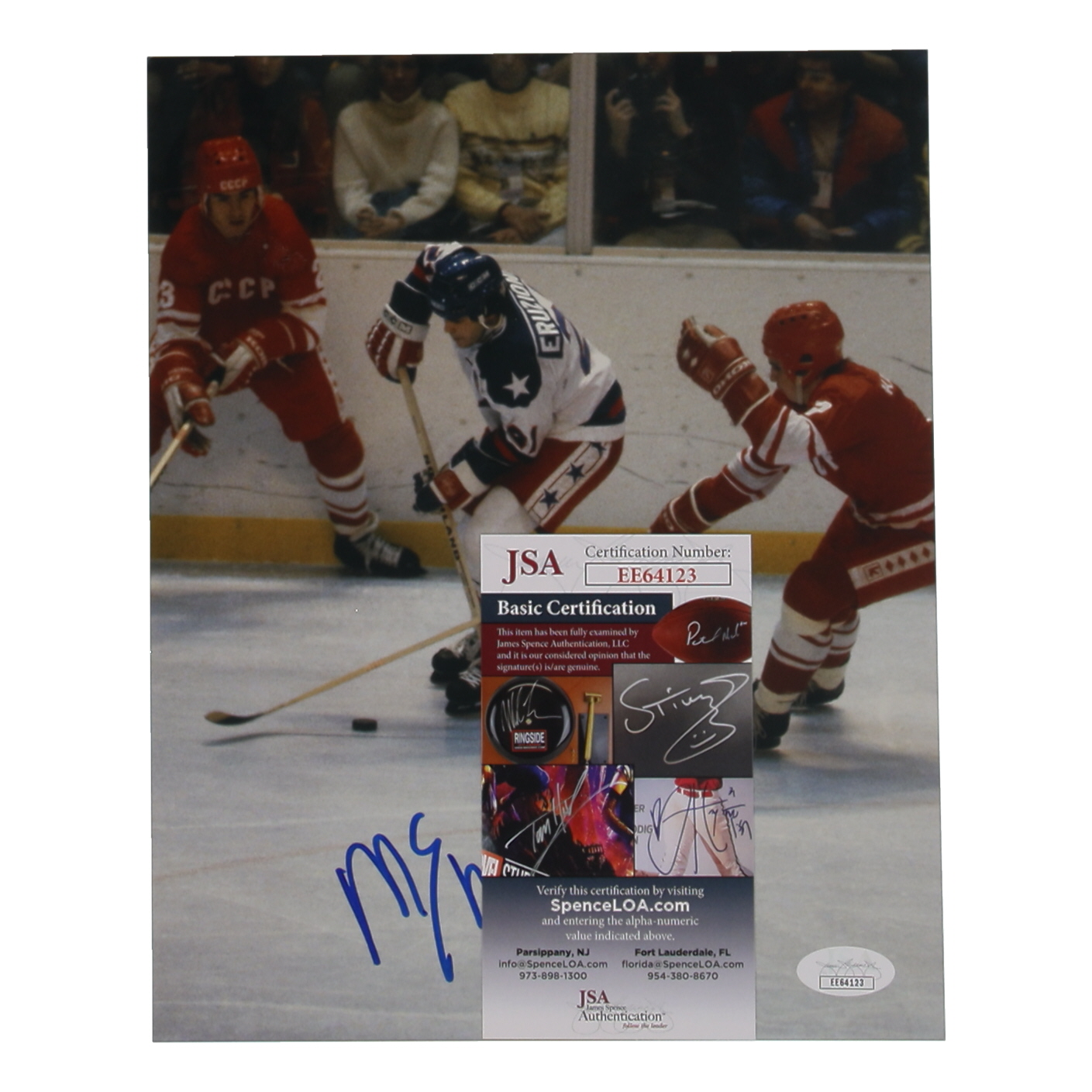 Photo measures approximately 8" x 10" in size. Hand-signed by Mike Eruzione.
