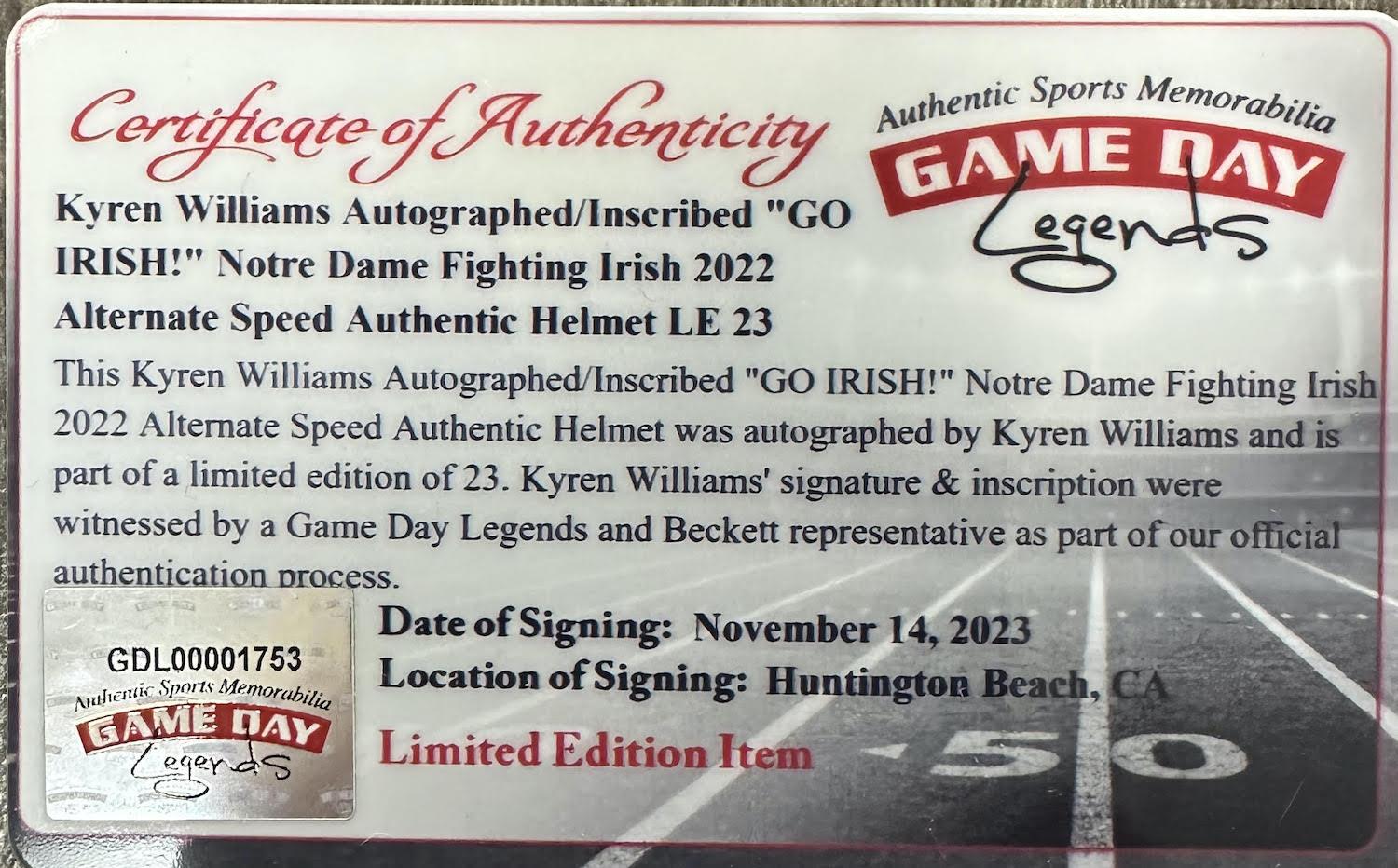 Riddell Notre Dame Fighting Irish full-size authentic on-field Speed helmet. Hand-signed and inscribed by Kyren Williams. Helmet is limited edition and hand-numbered #1/23.